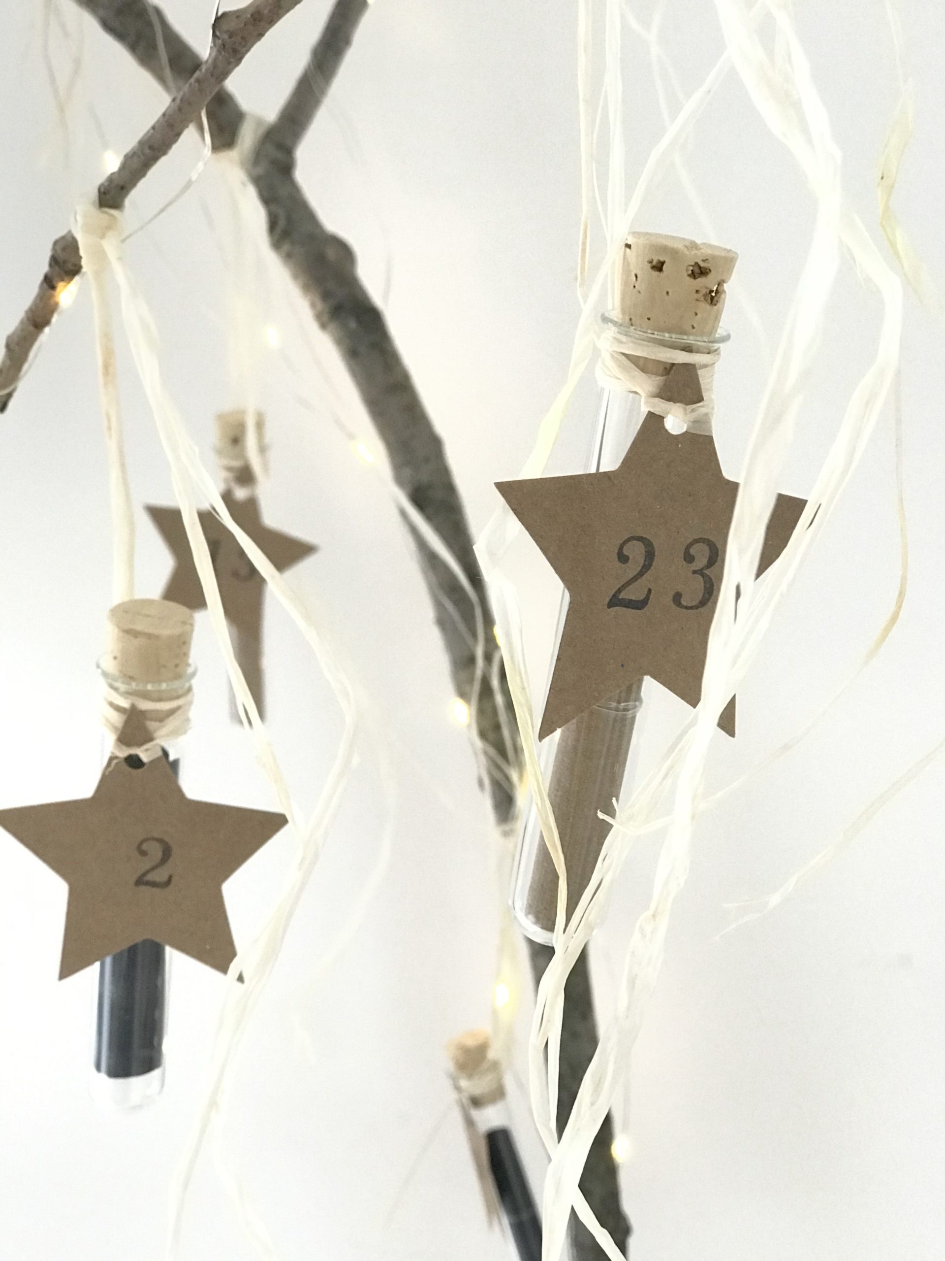 Die Sterne bindet ihr mit Naturbast an den Hals der Reagenzgläser.