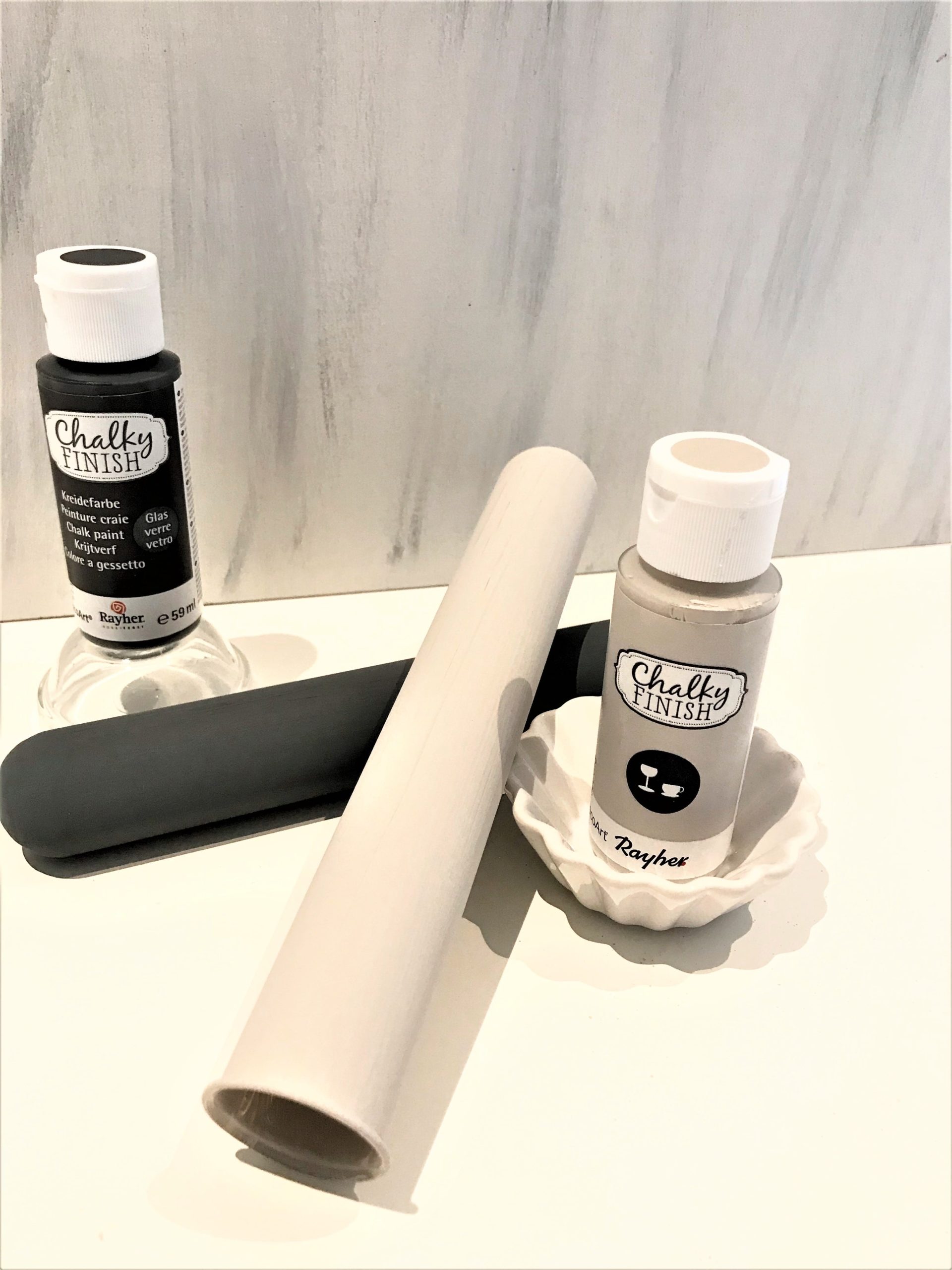 Weil man hier auch noch ein kleines Geschenk verpacken kann, sollte das Glas nicht durchsichtig sein. Rayher hat ganz tolle Kreidefarben, die Chalky Finish Farben für Glas im Sortiment. Ihr pinselt die Farbe gut deckend auf, wartet 4 Tage und dann wird die Chalky Finish Farbe für Glas im kalten Backofen bei 160 Grad Celsius für 30 Minuten eingebrannt. Die Röhrchen im Ofen auskühlen lassen. Anschließend hält die Farbe richtig, richtig gut auf dem Glas, ist sogar spülmaschinenfest. Vor dem Backen könnt ihr die Farbe übrigens  wieder abwaschen oder mit dem Fingernagel abkratzen, wenn ihr euch z.B. vermalt habt.