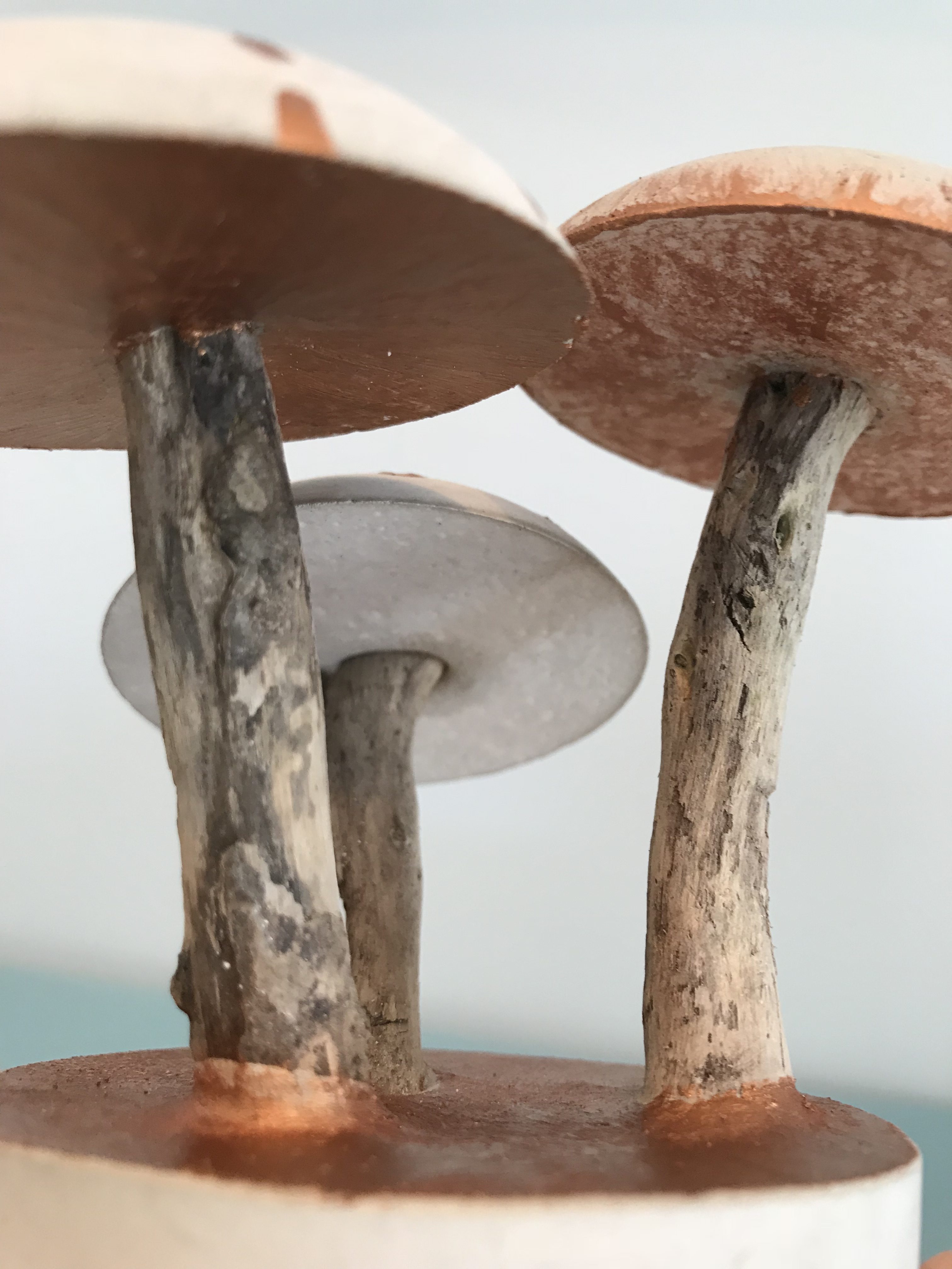Man kann die Pilzhüte auch mit Modelliermasse oder Knetbeton formen und die Äste dann mit Kleber in den Hut kleben: