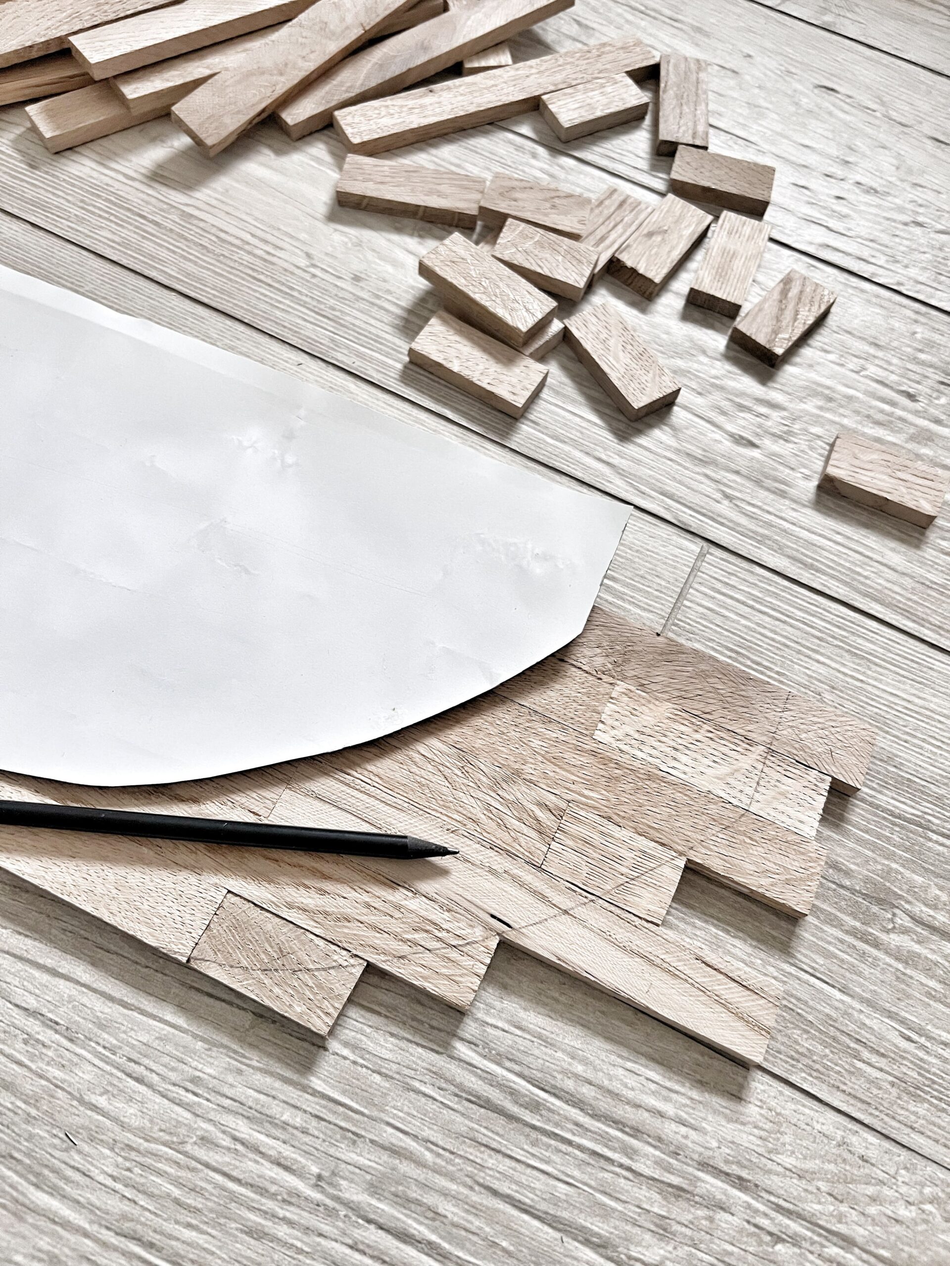 - Eine Seitenplatte liegt jetzt flach vor euch auf dem Tisch und ihr verleimt senkrecht dazu 16 Klötzchen, welche später den Boden vom Erntekorb bilden. Dabei könnt ihr weitere Klötzchen als temporäre Abstandshalter verwenden.