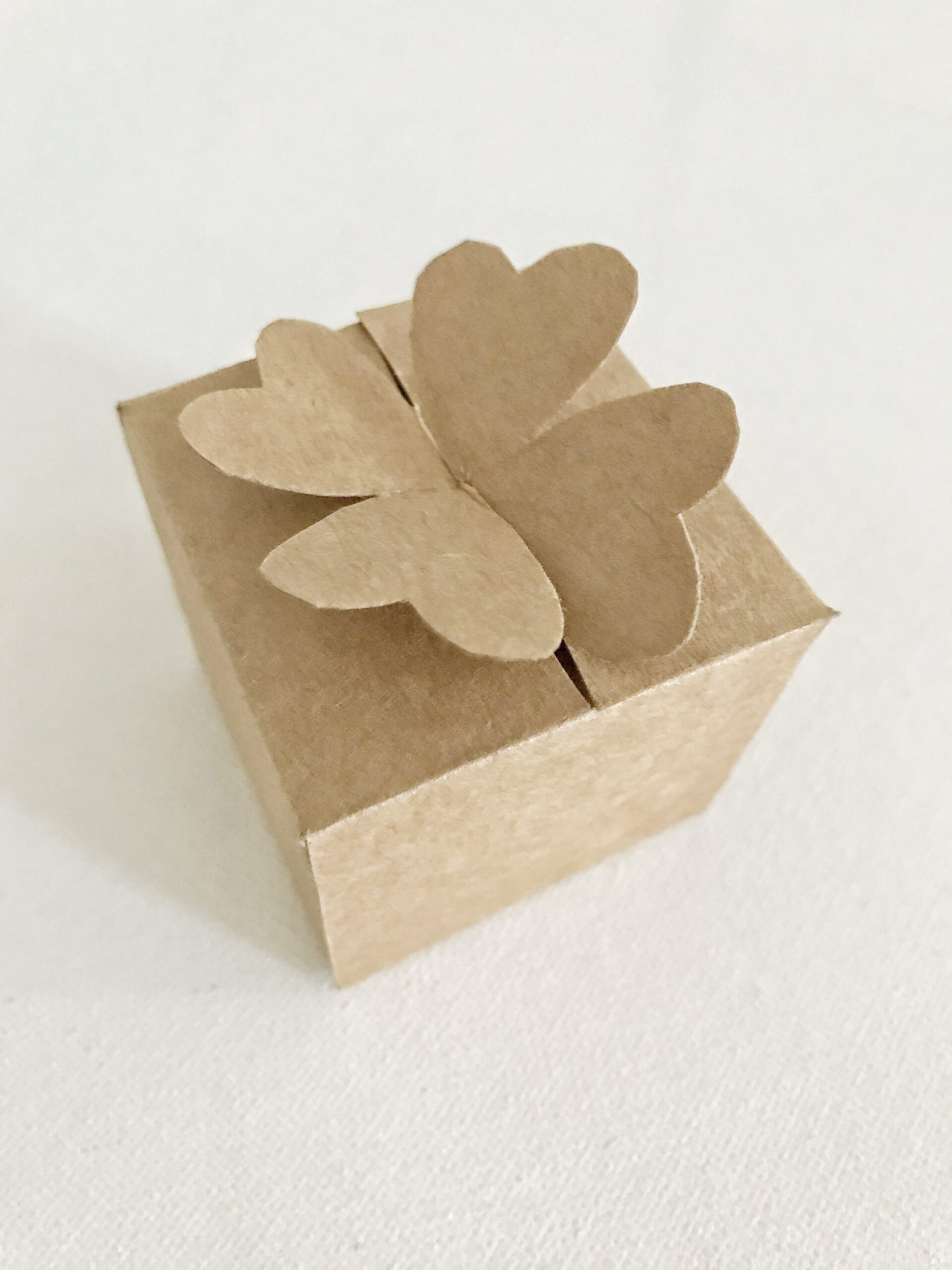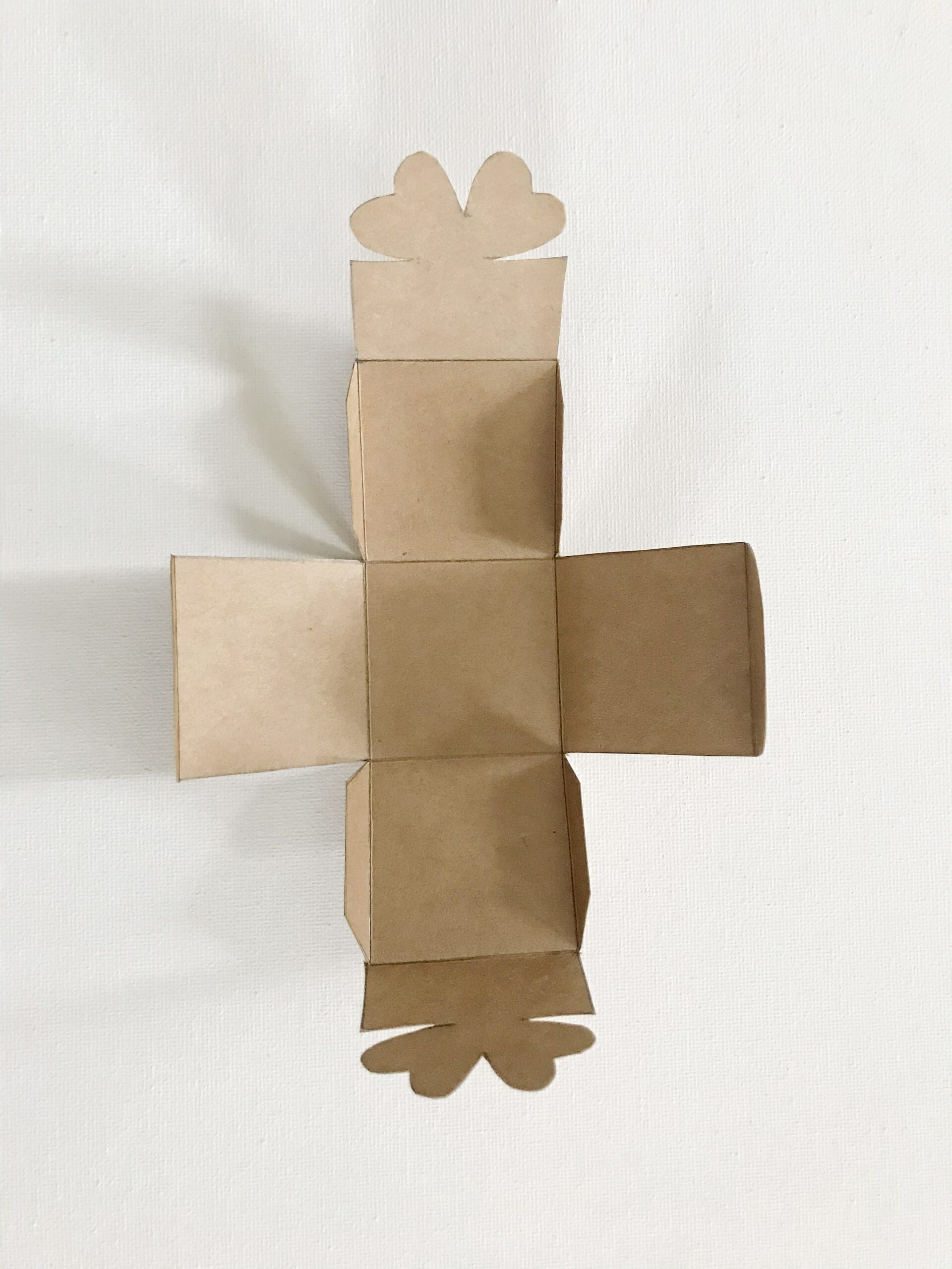 - Die Box wird oben verschlossen, indem die Kleeblatthälften ineinandergeschoben werden. Der Clou dabei ist, dass die Schlitze unterschiedlich lang sind, sodass die Hälften perfekt zusammenpassen.