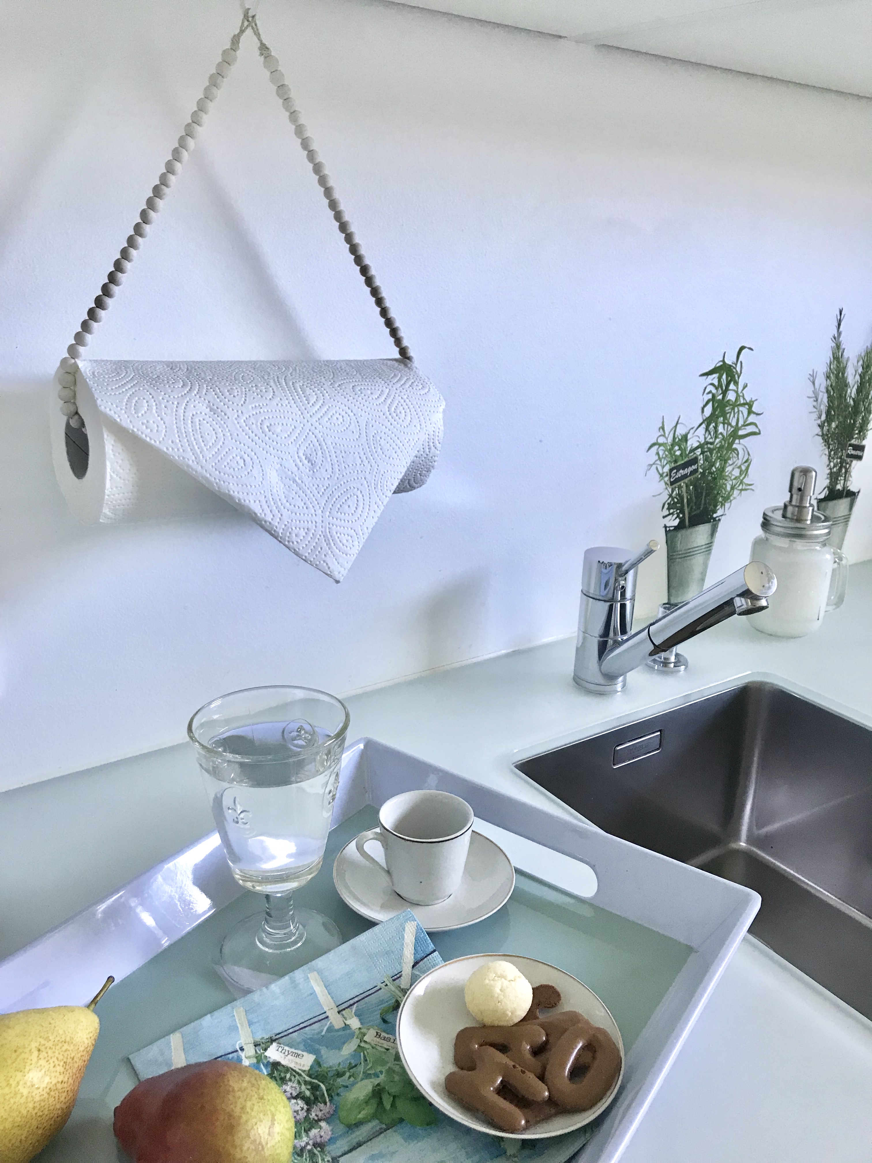 Küchenrollen-Gadget: Küchenrollenhalter aus Holzkugeln basteln. Schöne und sehr praktische Idee. Anleitung auf dem Blog. #Chalet8, #KüchenrollenGadget