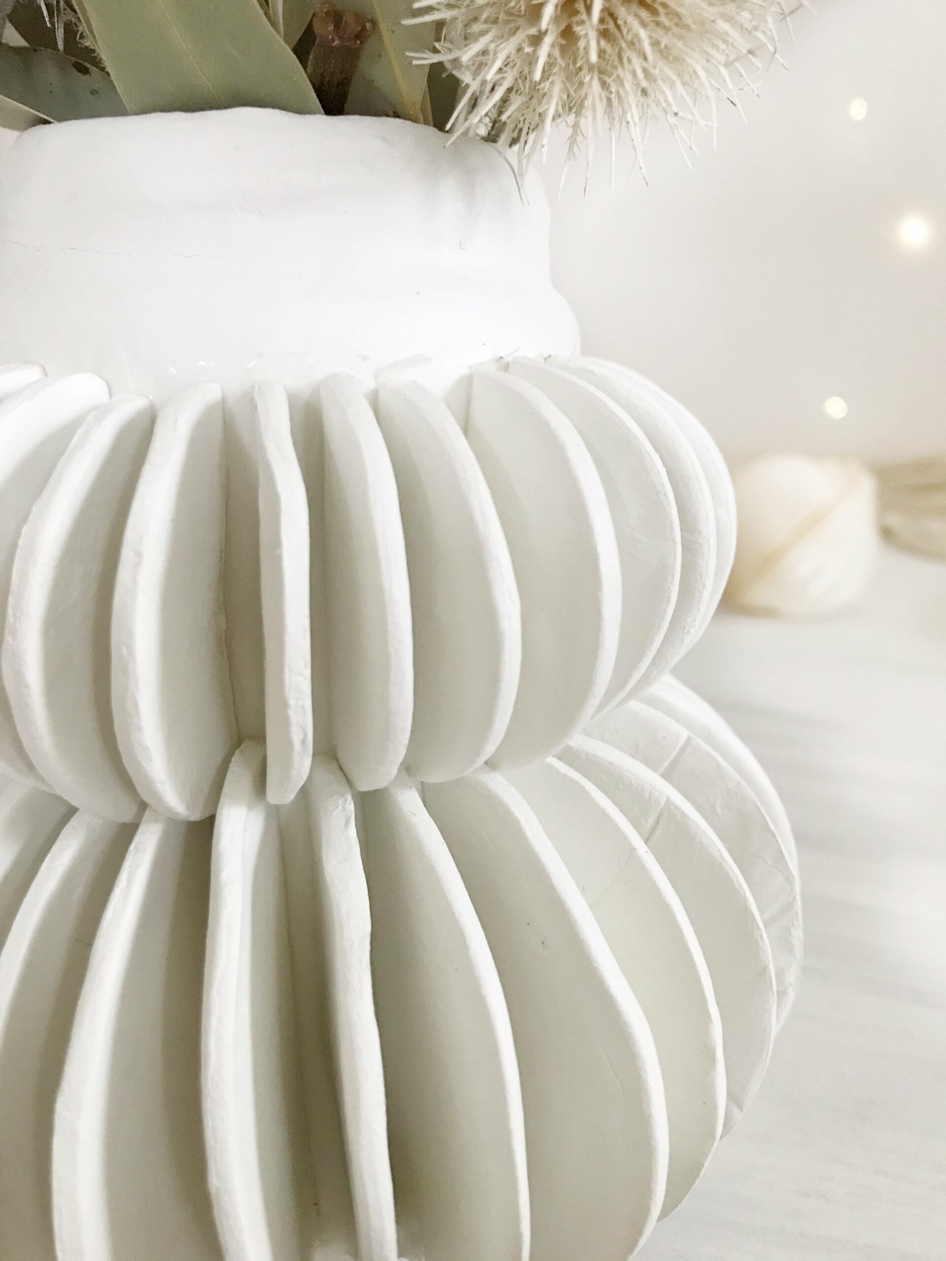Diese Lamellen Vase könnt ihr einfach selber töpfern ohne brennen. Für die lufttrocknende Modelliermasse braucht ihr keinen Ofen.
