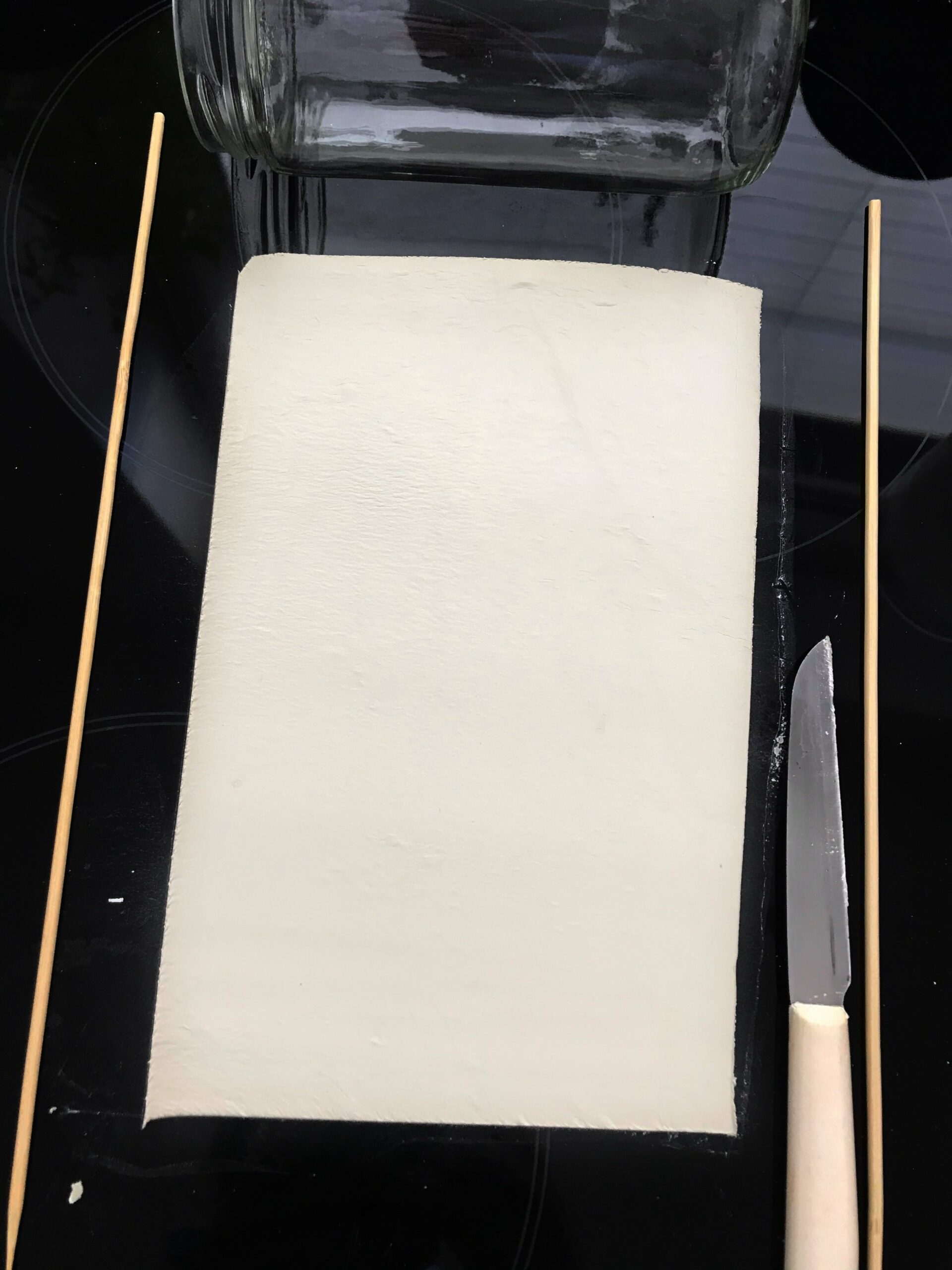 - Da das Rechteck aus Modelliermasse auf dem Backpapier haftet, könnt ihr es nun bequem auf das Glas legen und dann das Backpapier abziehen.