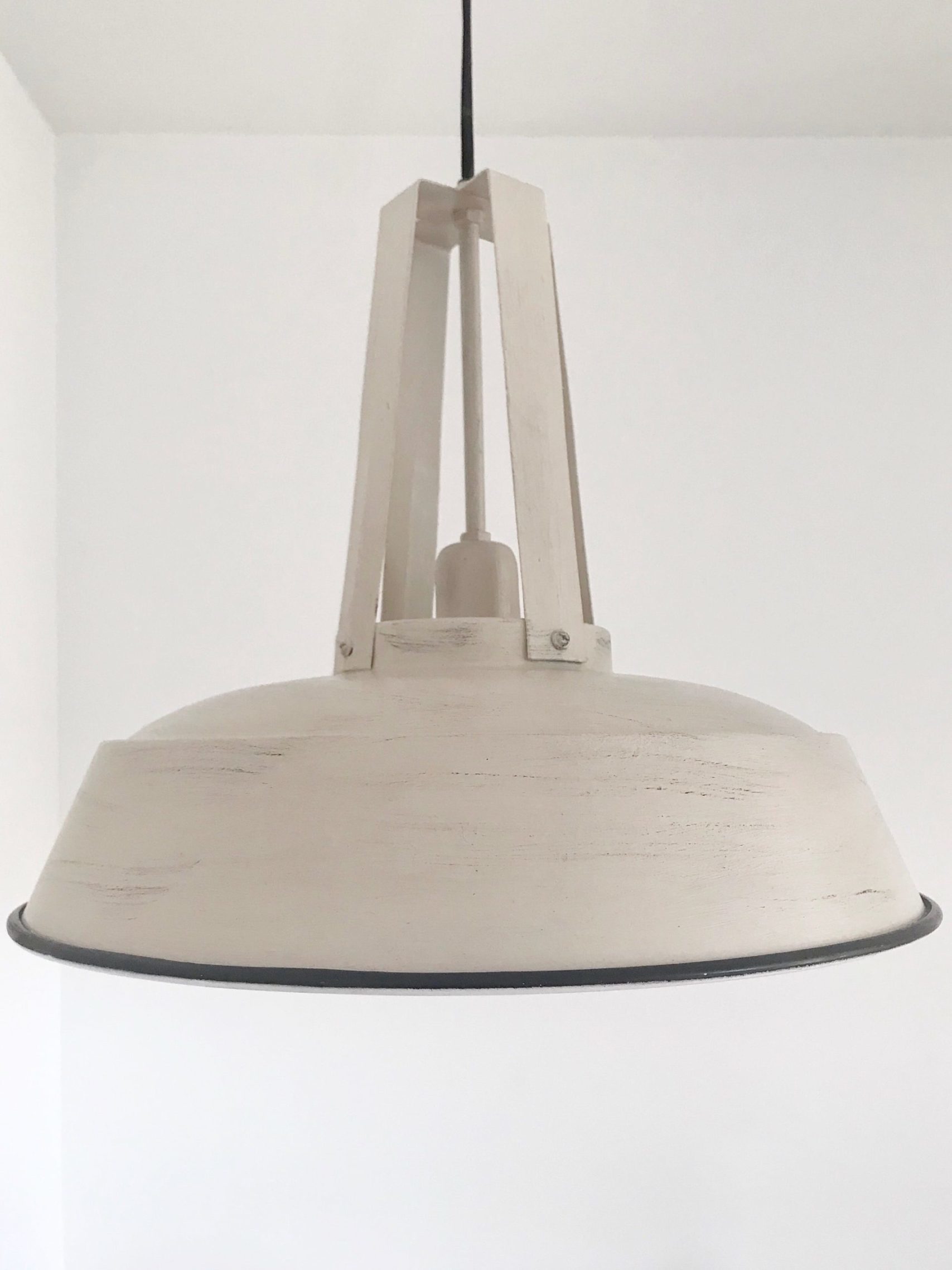 Wenn ihr noch Naturmaterial übrig habt, könnt ihr euch noch eine passende Tischdekoration basteln. Meine Esstischlampen hatten ein sehr schönes Rauchblau, aber inzwischen habe ich mich an der Farbe etwas satt gesehen. Mit Kreidefarbe in einem schönen Sandton habe ich ihnen ein neues Outfit verpasst. Damit die Lampen nicht zu angemalt und clean aussehen, habe ich noch mit Tafellack und einem alten Borstenpinsel ein paar schwarze Schlieren aufgemalt. Das passt gut zu dem Industrie Stil der Lampen.