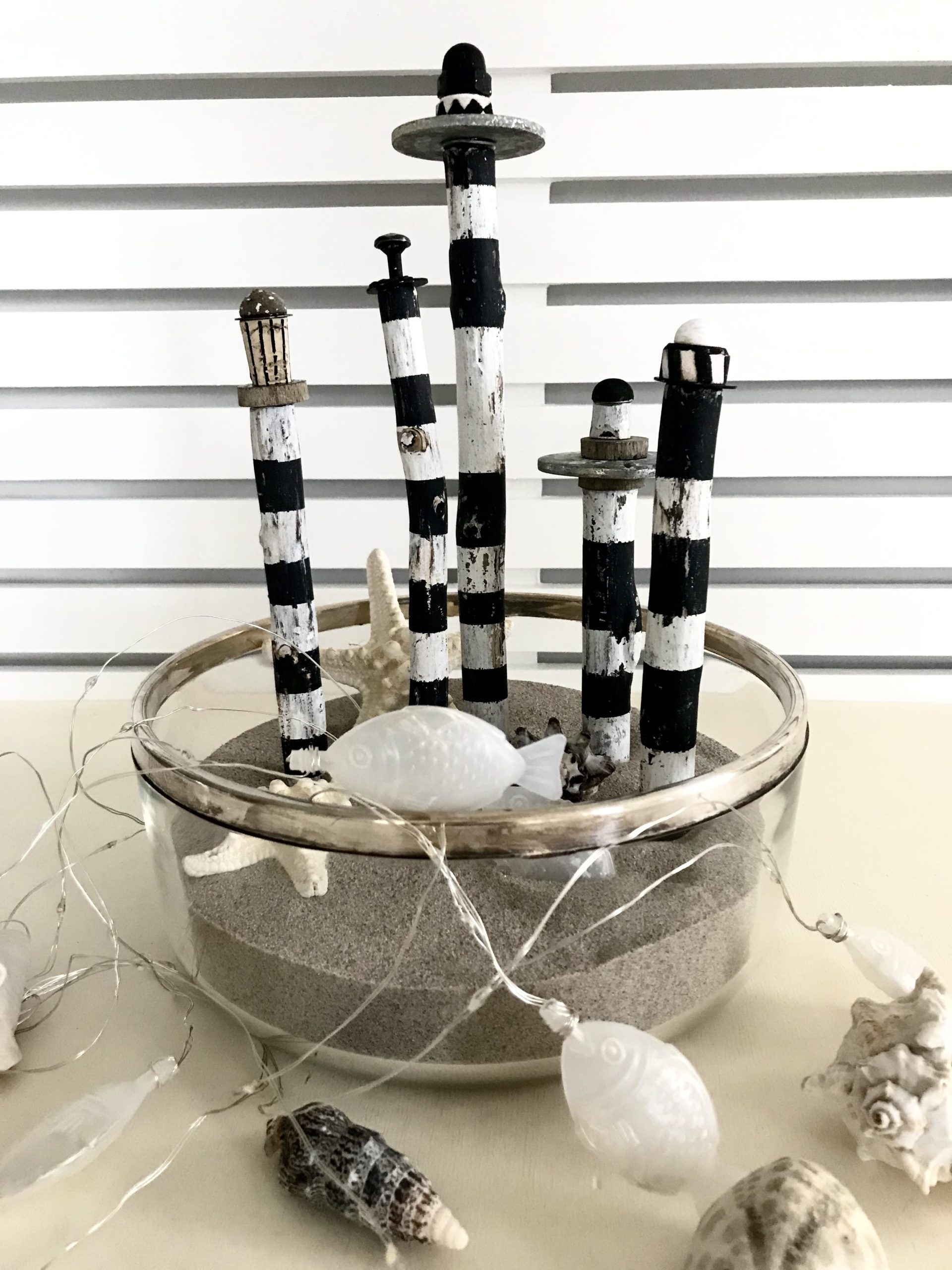 Ein Leuchtturm alleine ist so einsam. Also am besten macht ihr gleich mehrere auf einmal. In einer Schale mit Sand und mit ein paar maritimen Accessoires kommt die Leuchtturm Bande aus Treibholz besonders schön zur Geltung.