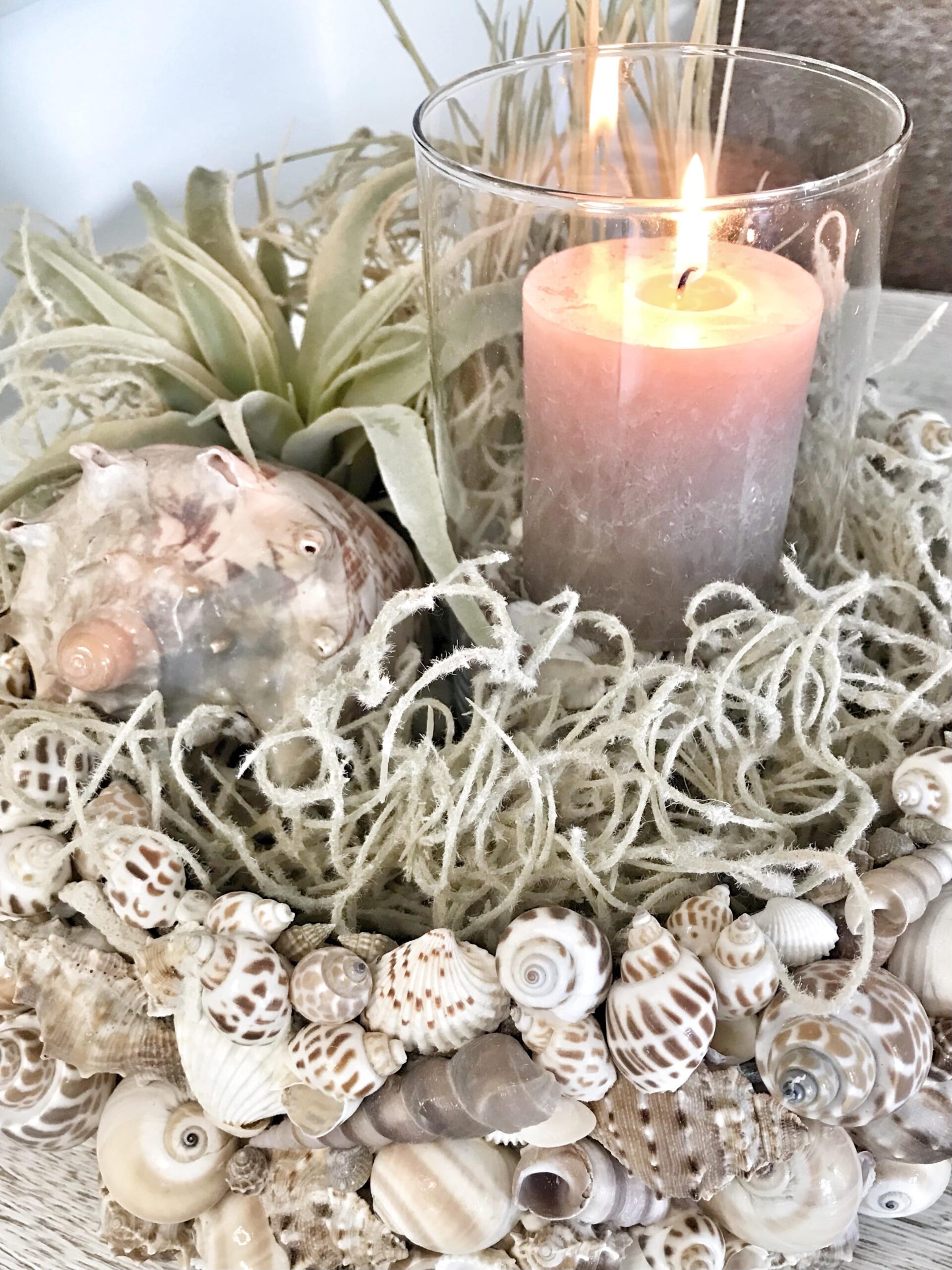 Im Moment gefällt mir meine maritime Deko mit dem Kerzenglas, der großen Muschel und den Kunstblumen ganz gut. Aber spätestens im nächsten Sommer kommen da richtige Blümchen oder Gräser rein.