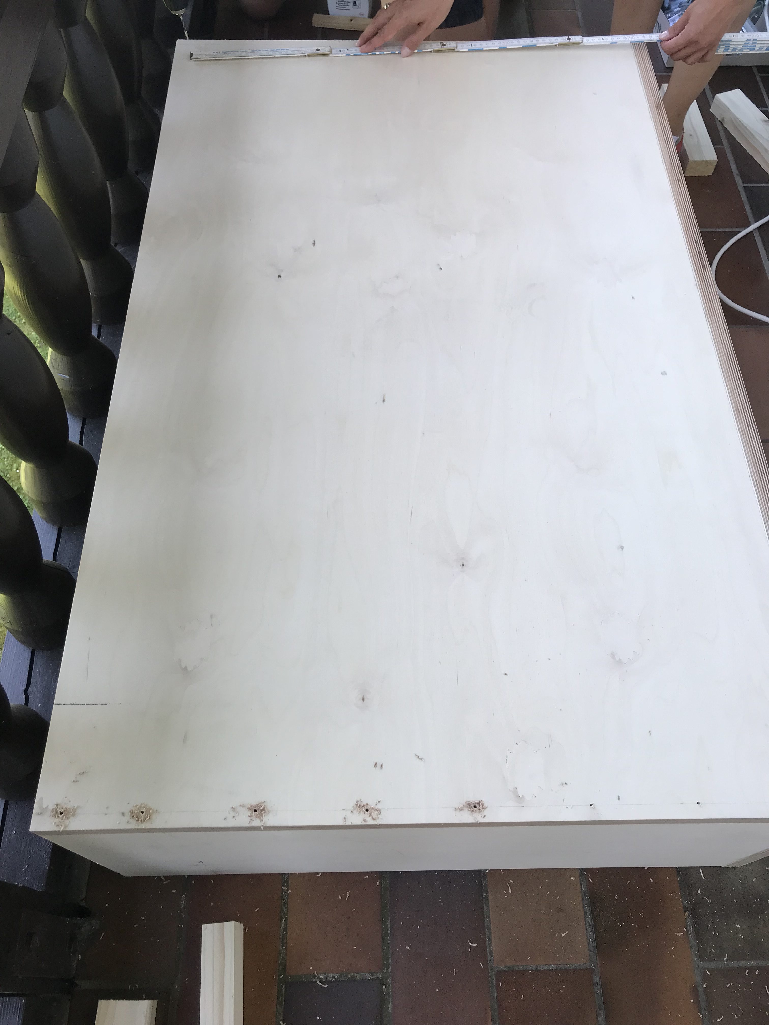 Die Tischplatte des Pflanzregals sollte bewusst an den Seiten und vorne etwas überstehen, während der Einlegeboden etwas zurückversetzt sein sollte. Ich finde es wirkt so einfach etwas aufgelockerter und gefälliger, als wenn alle waagrechten Bretter in einer Flucht sind. Für die Bodenplatte wurde die doppelte Stärke verwendet, damit das Pflanzregal möglichst viel Stabilität bekommt. Die maximale Brettstärke, die mein Baumarkt auftreiben konnte waren 26 mm, also besteht der Boden aus 2 Brettern und hat jetzt eine Stärke von 52 mm.