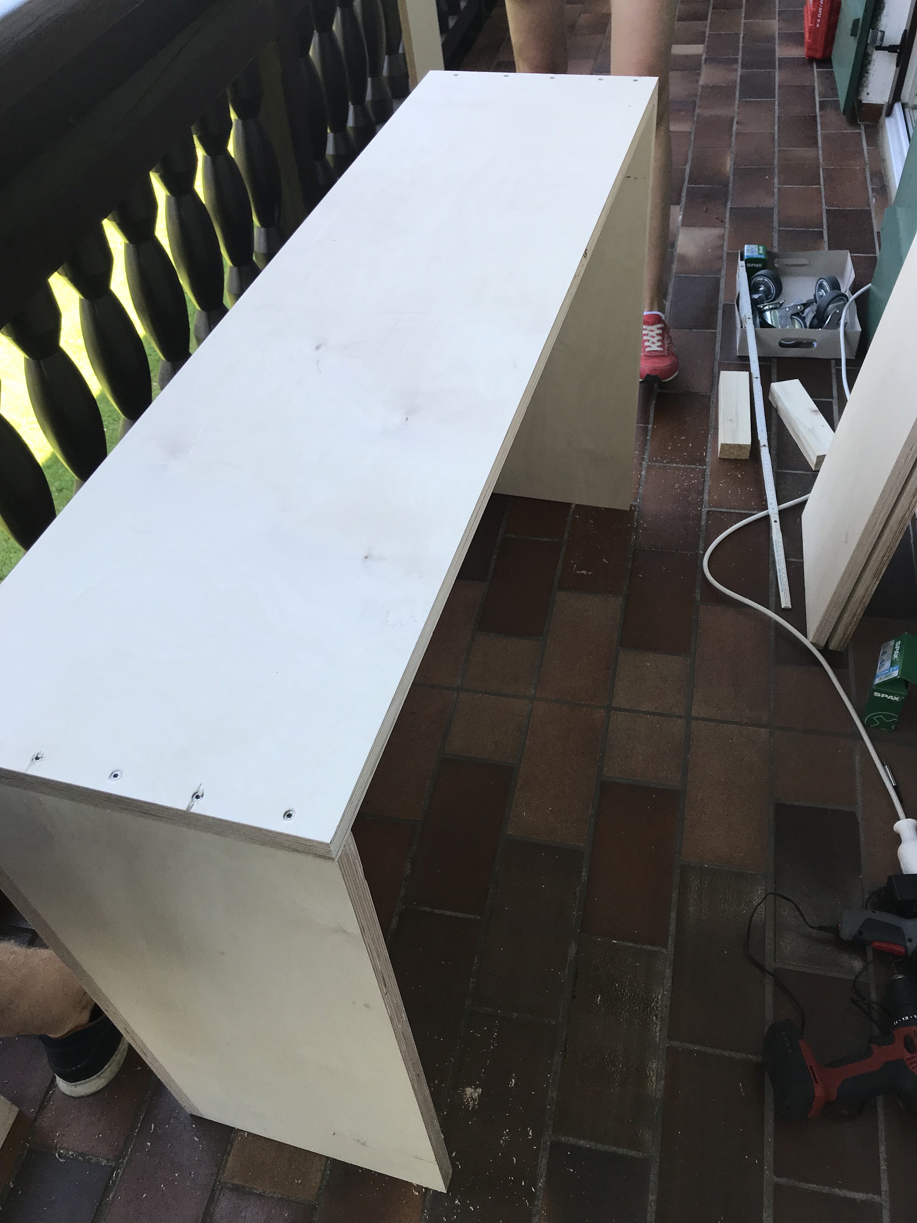- Alle folgenden Arbeiten müssen draußen stattfinden, also braucht ihr ein paar wirklich sonnige Tage am Stück. Ansonsten müsst ihr die unbehandelten Teile immer wieder reinbringen, denn das unbehandelte Holz sollte nicht feucht werden.