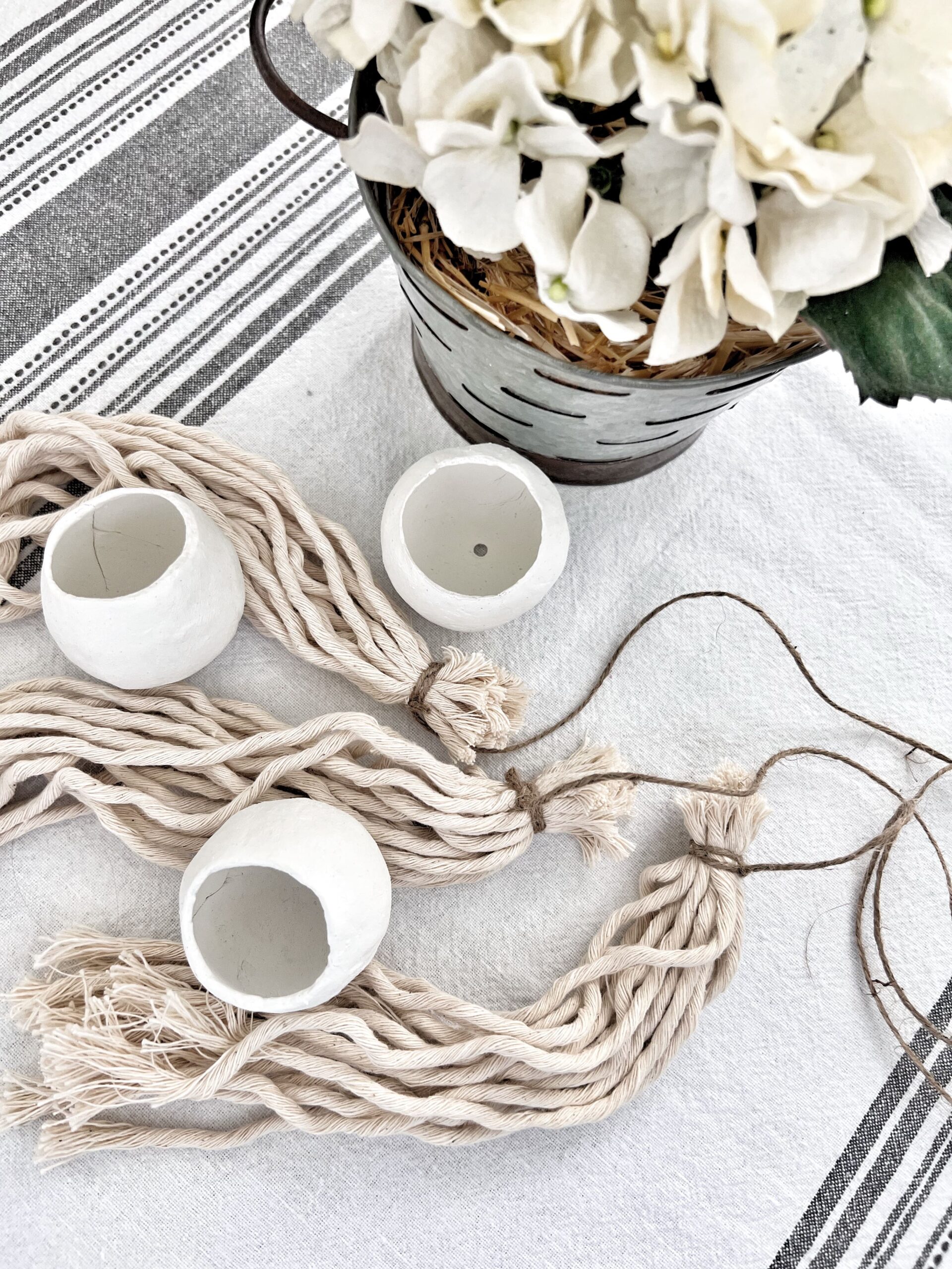 9.  Anschließend klebt ihr das Makrameegarn Bündel in die Hohlkugel, wobei ihr die Juteschnur, die aus dem kleinen Loch in der Hohlkugel heraukommt, auf Spannung haten solltet.