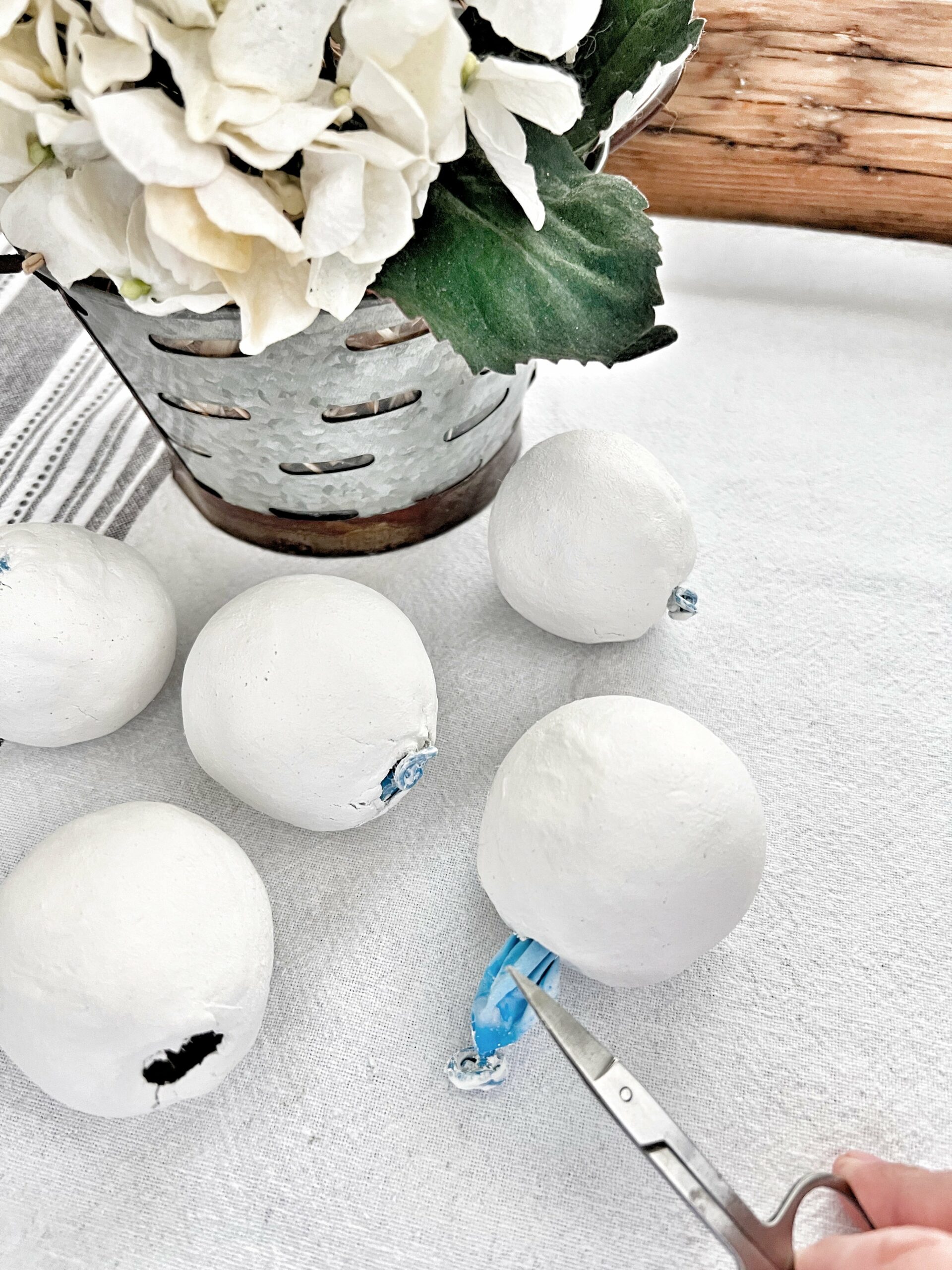 8. Das lange Ende der Juteschnur fädelt ihr  durch das kleine Loch in der Modelliermasse-Kugel.