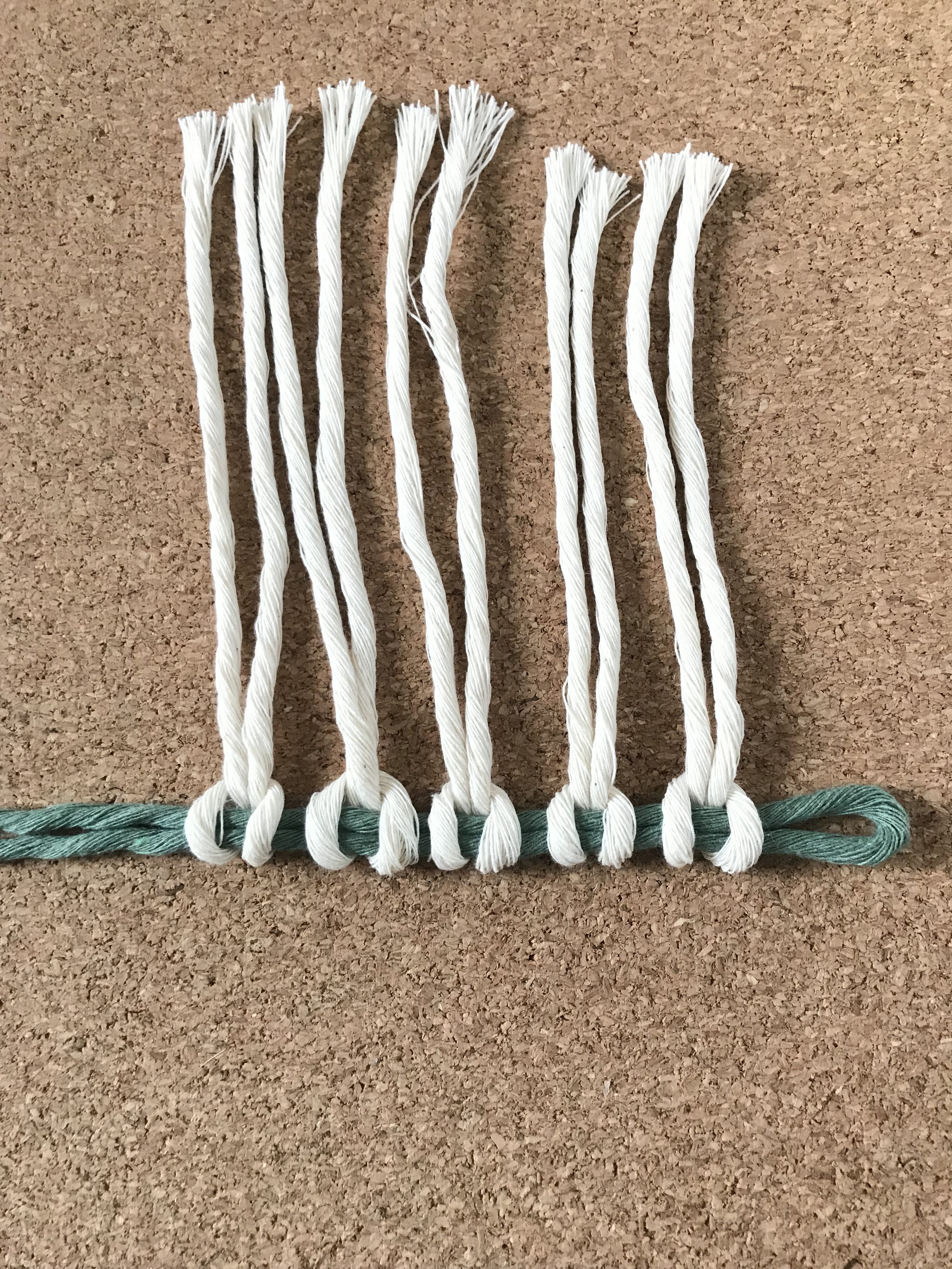 Der grüne Leitfaden sollte ca. 2,5m lang sein. Für den Anfang braucht ihr ca. 10 weiße Arbeitsfäden von jeweils 90 cm Länge und dann nochmal 10 Stränge, die jeweils 60 cm lang sind. Ihr könnt dann bei Bedarf immer noch mal zusätzliche Arbeitsfäden von eurer Garnrolle abschneiden.
