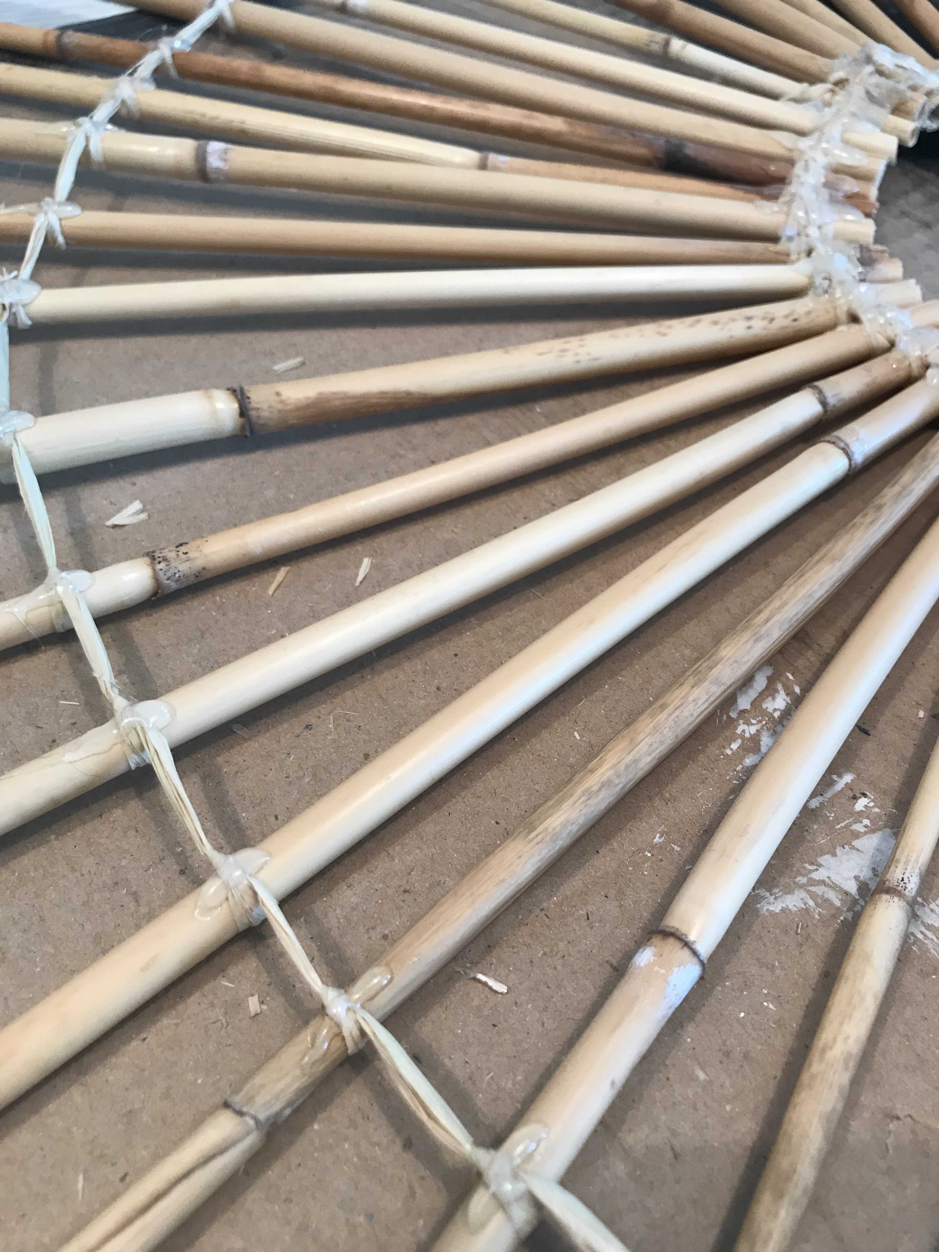 - Alle Bambusstäbe knotet ihr dann an der einen Seite mit dem Bast zusammen. Schaut euch gerne die Collage an, wo ich versucht habe meine Knotentechnik bestmöglich darzustellen.
