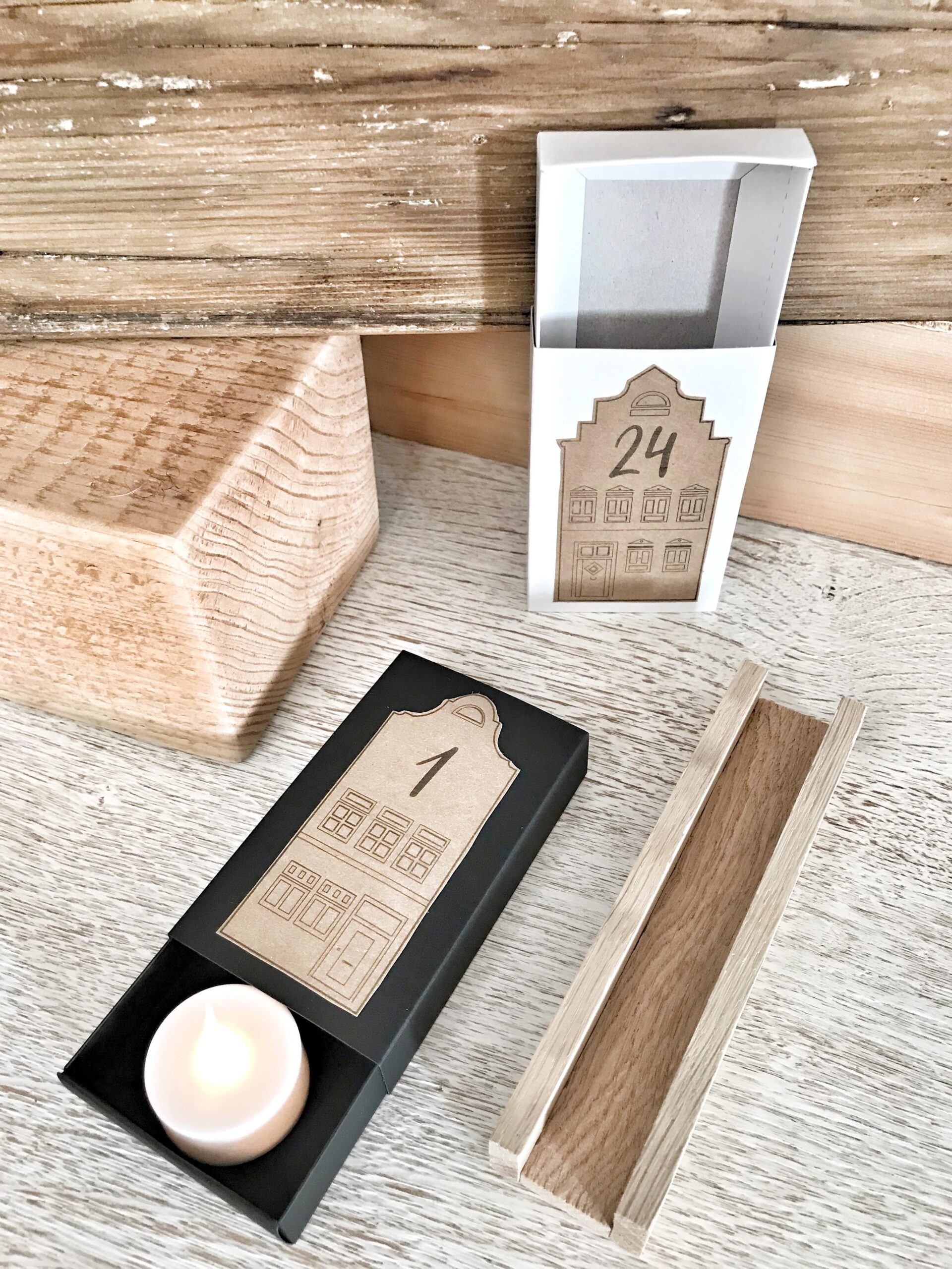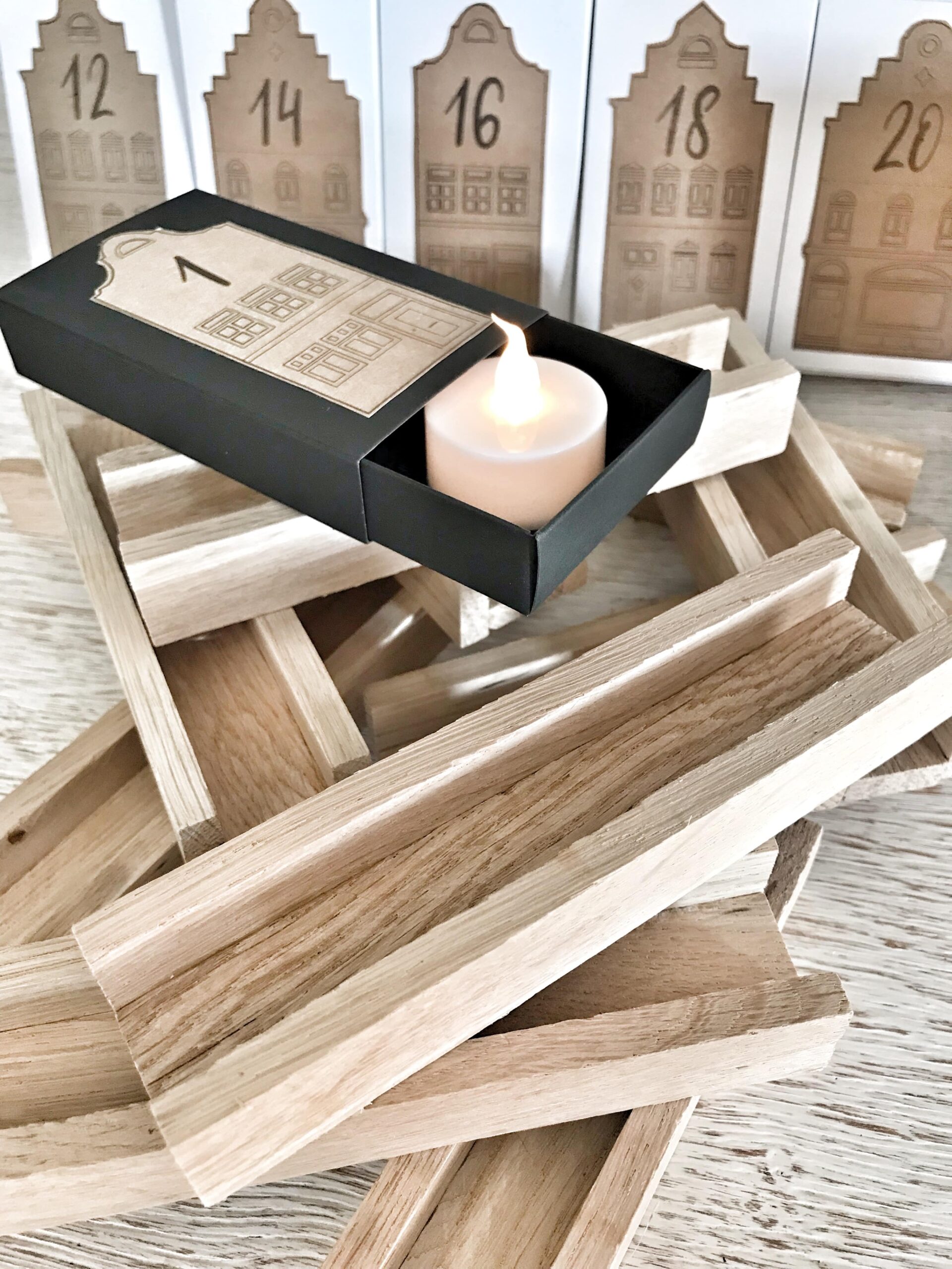 Ihr könnt den Streichholzschachtel Adventskalender z.B. in einer schönen Holzkiste, einem kleinen Koffer oder auf einem Tablett dekorieren. Das Häusermotiv ruft aber geradezu danach stehend als Winterdeko dekoriert zu werden. Dafür habe ich kleine Holzständer entwickelt, die ganz einfach und schnell gebaut werden können.