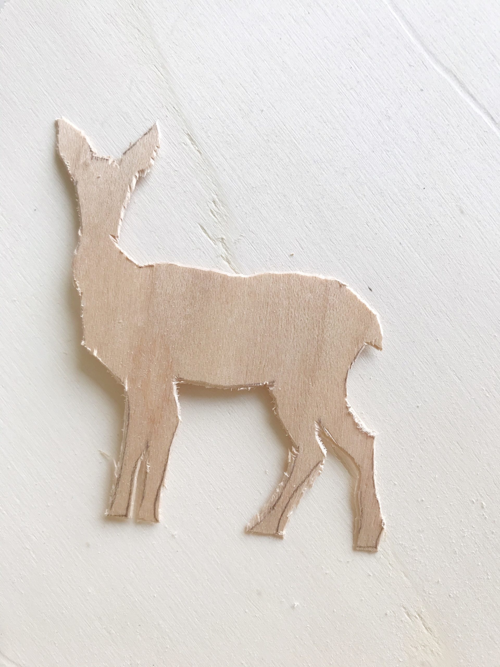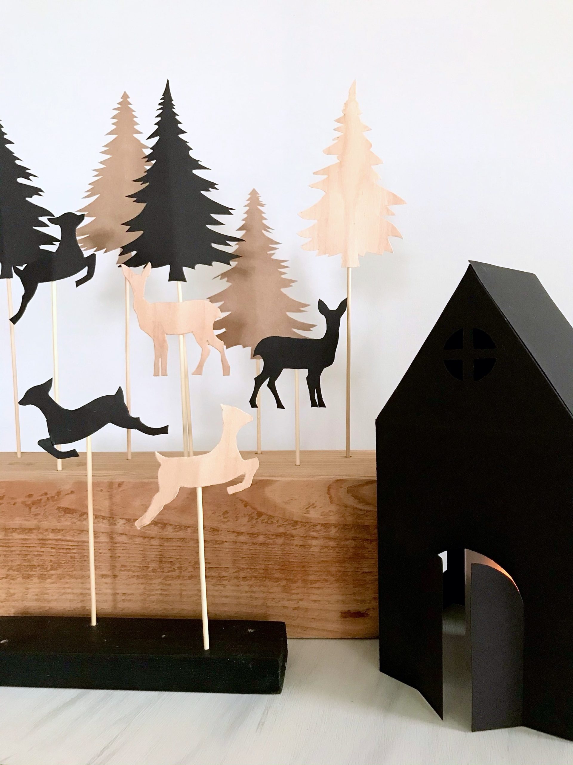 - Für die Bäume und Rehe druckt ihr euch am besten die Vorlage Winterlandschaft aus und übertragt die Umrisse auf den Tonkarton oder das Furnierholz.