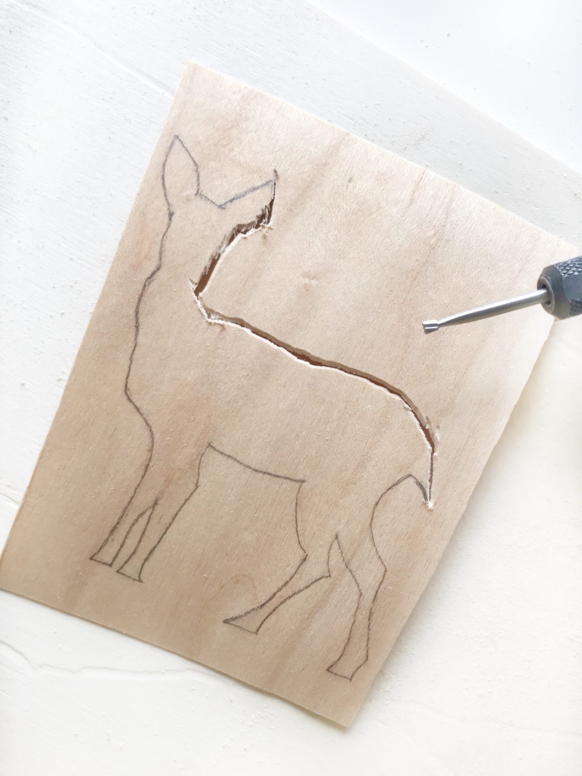 - Den Tonkarton könnt ihr ganz old-school mit der Nagelschere ausschneiden. Beim Furnierholz muss man sehr vorsichtig schneiden, da das Holz leicht ausbricht. Wenn ihr es mit der Nagelschere schneidet, erst mal den groben Umriss ausschneiden und dann die Feinheiten ausarbeiten. Besser gelingt es, wenn ihr mit einem feinen Fräser die Umrisse der Figuren nachfahrt. Also wie mit einem Stift entlang der Linie fahren und dann löst sich die gewünschte Form heraus. Dabei solltet ihr unbedingt auf einer unempfindlichen Unterlage arbeiten. Anschließend die Kanten mit dem Schleifpapier glätten.