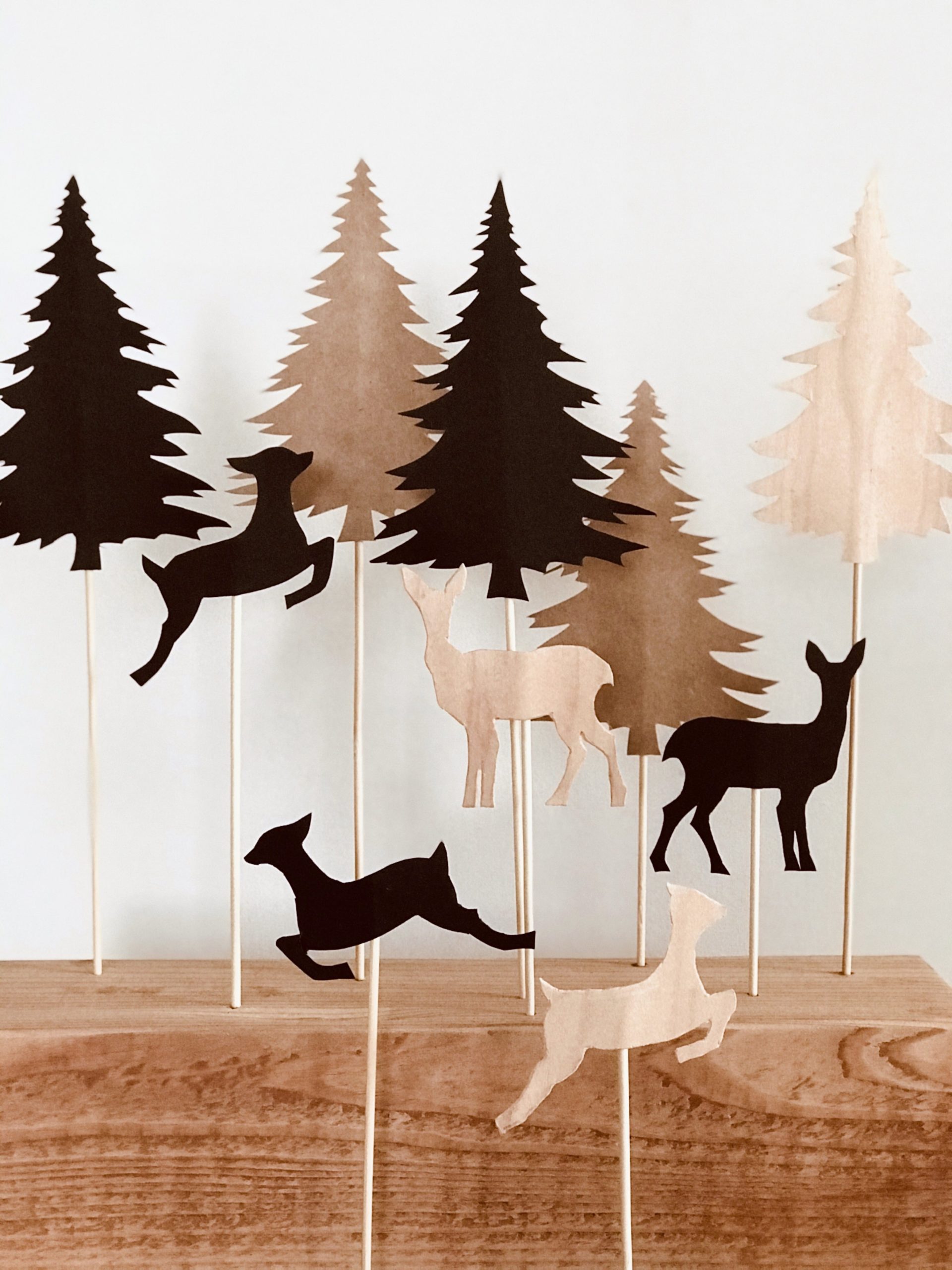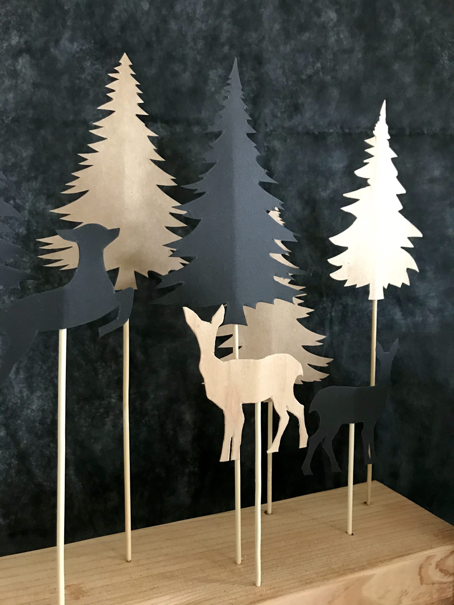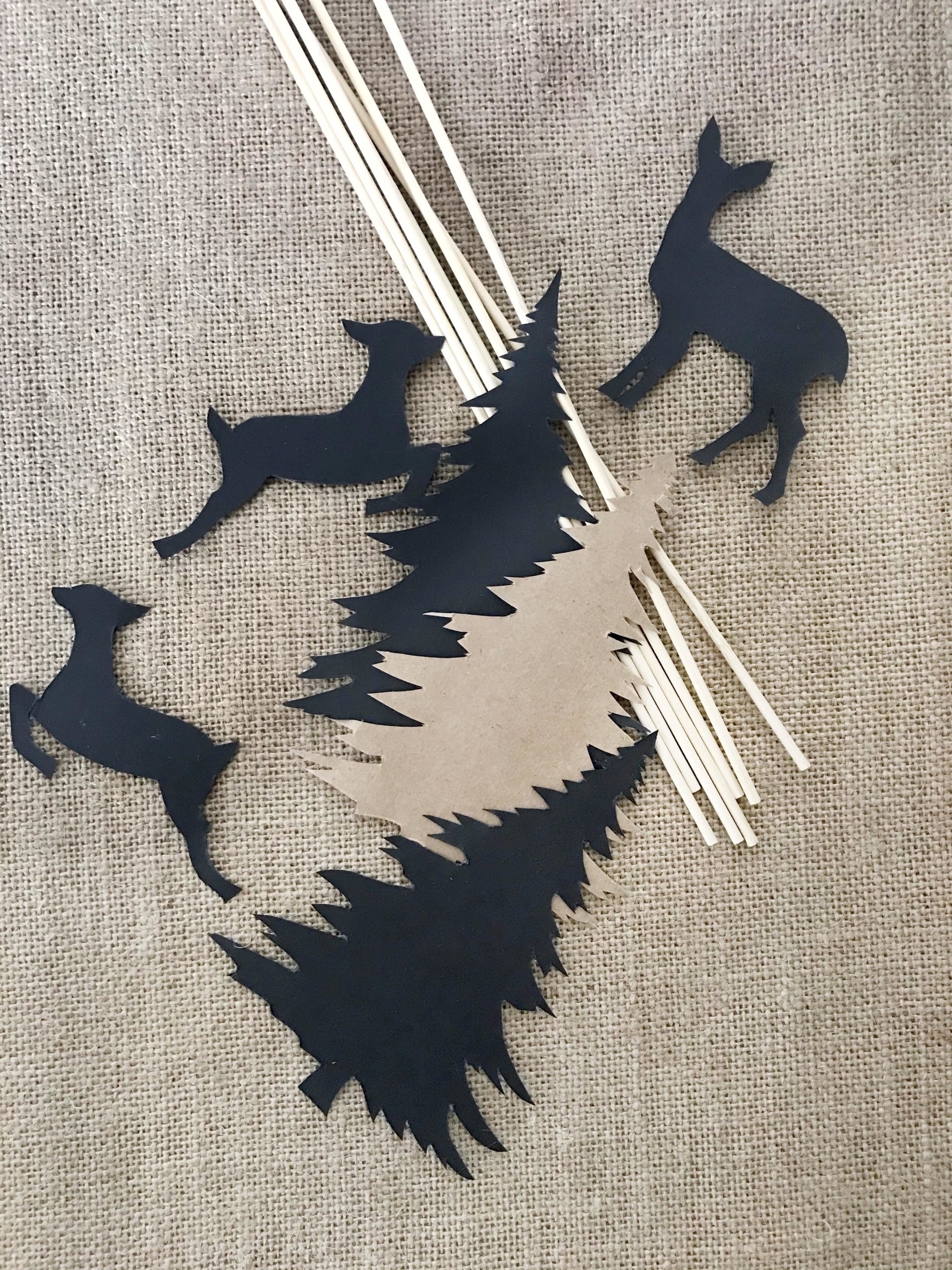 - Die ausgeschnittenen Rehe und Bäume klebt ihr auf einen Schaschlikspieß. Die Spieße sollten dabei unterschiedliche Längen haben. Für die Tannen sollten die Spieße länger sein als bei den Rehen.