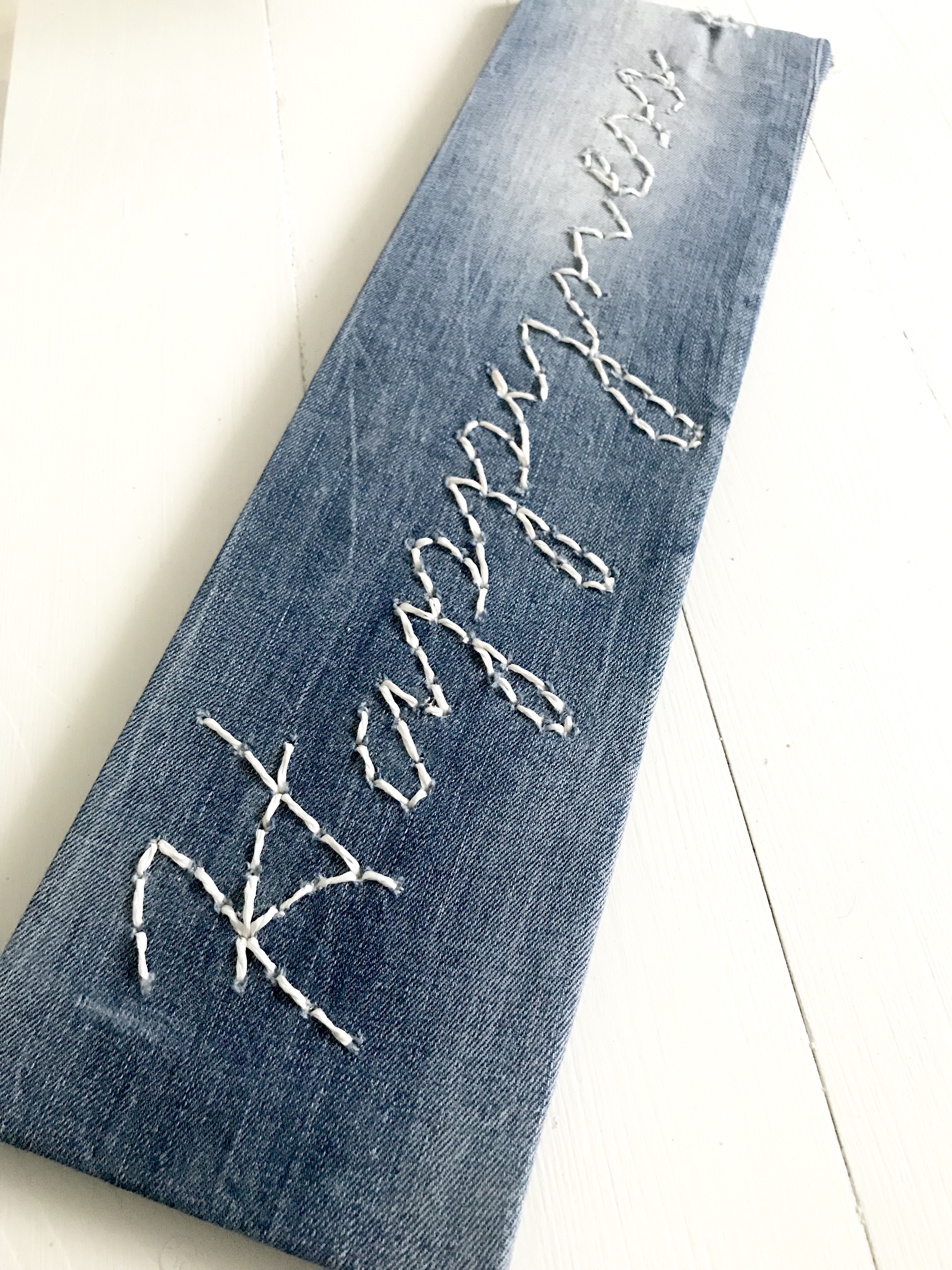 1. Jeans-Upcycling-Schild mit gesticktem Schriftzug