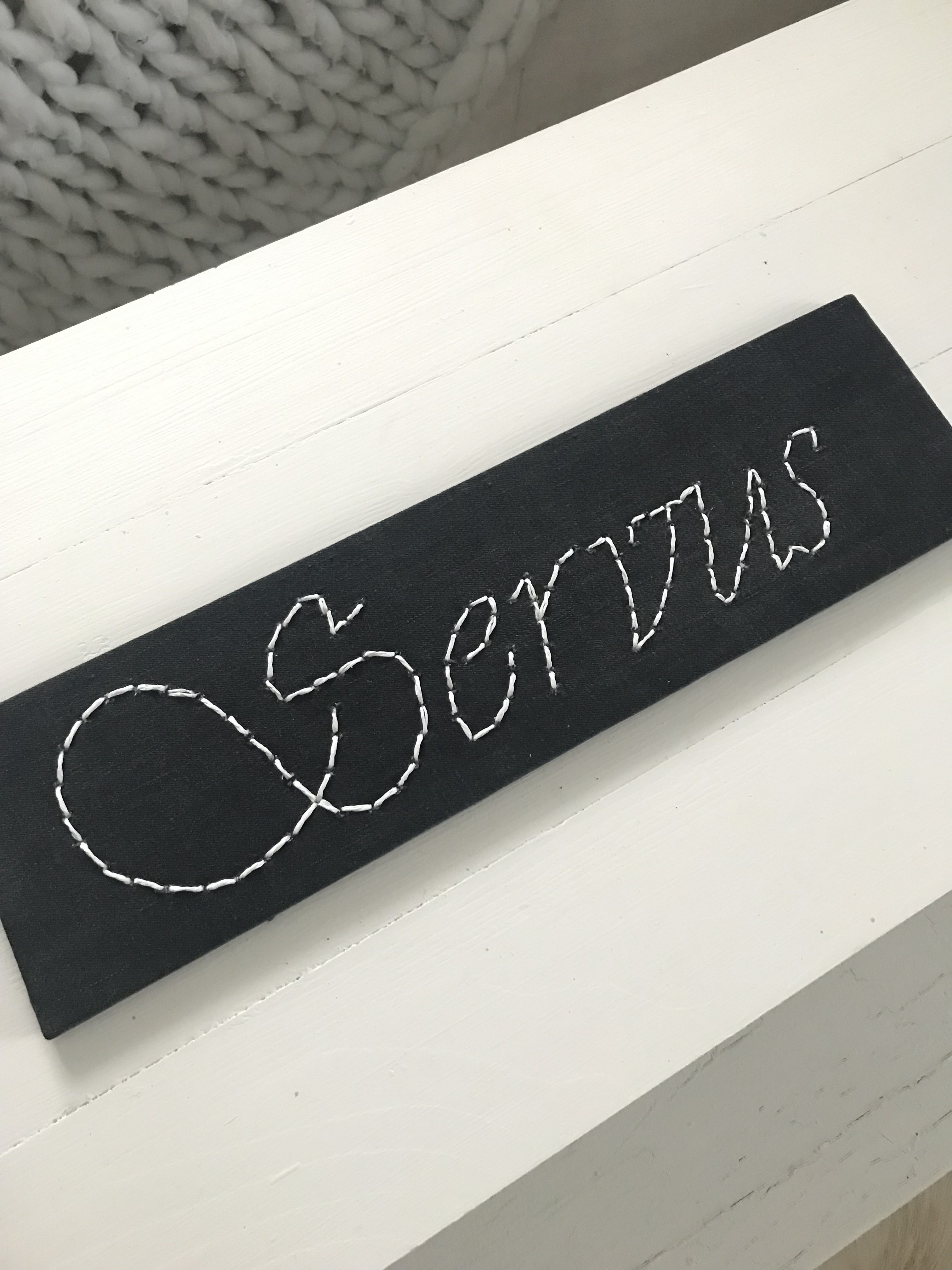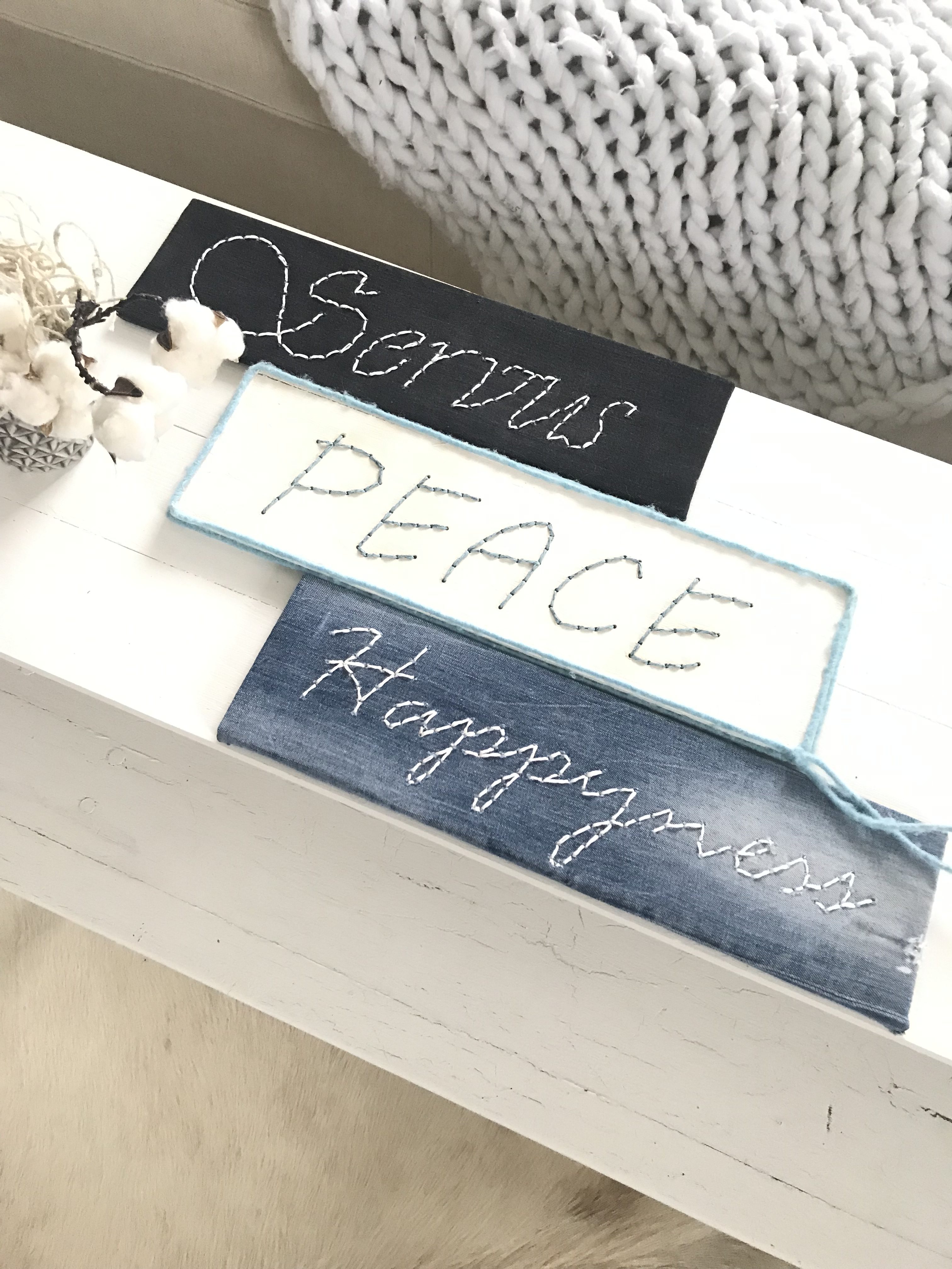 Ihr könnt solche bestickten Holzschilder natürlich auch ohne Jeansstoff gestalten, siehe Schild mit „Peace“ Schriftzug.