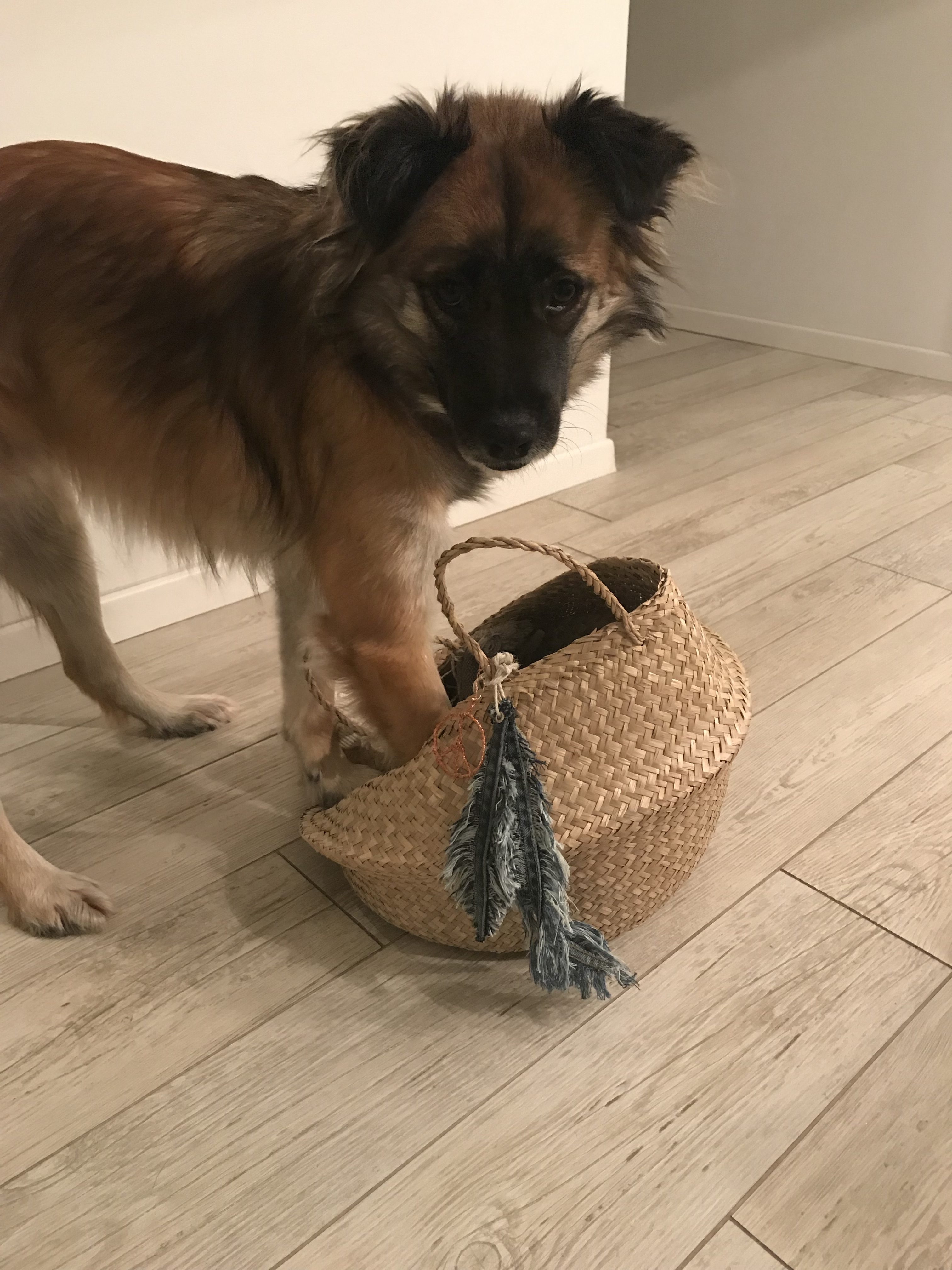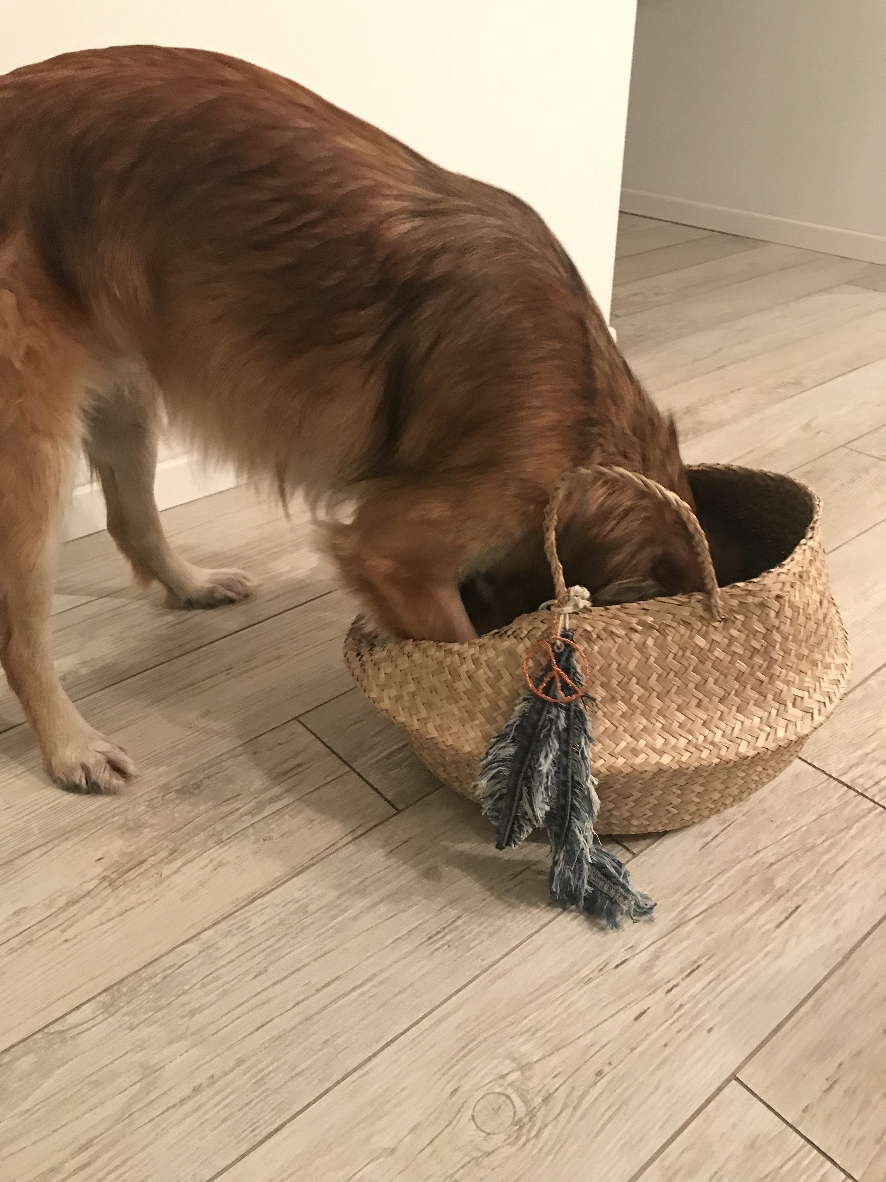 Jannik sucht Leckerli in seinem Spielzeugkorb