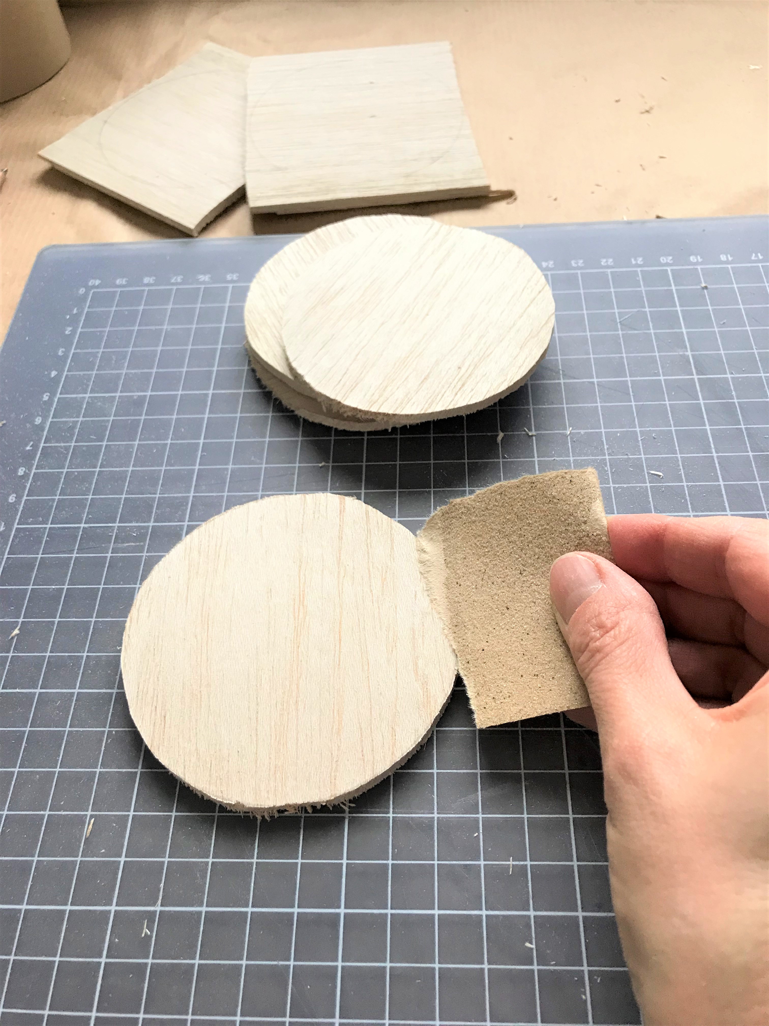 • Einen der kleinen Kreise mit Holzleim mittig auf den großen Kreis kleben. Das ergibt den Deckel. Diese Konstruktion sorgt dafür, dass der Deckel gut auf dem Dosenrand sitzt und nicht wegrutscht.