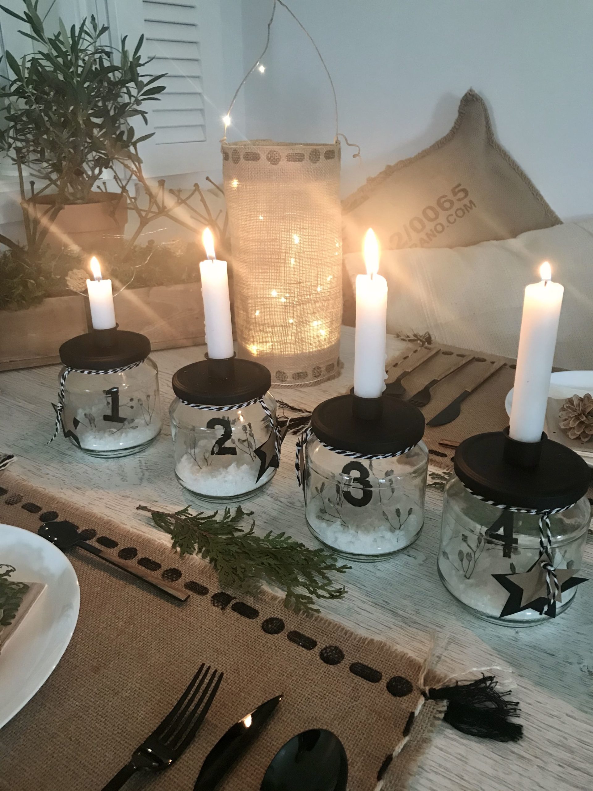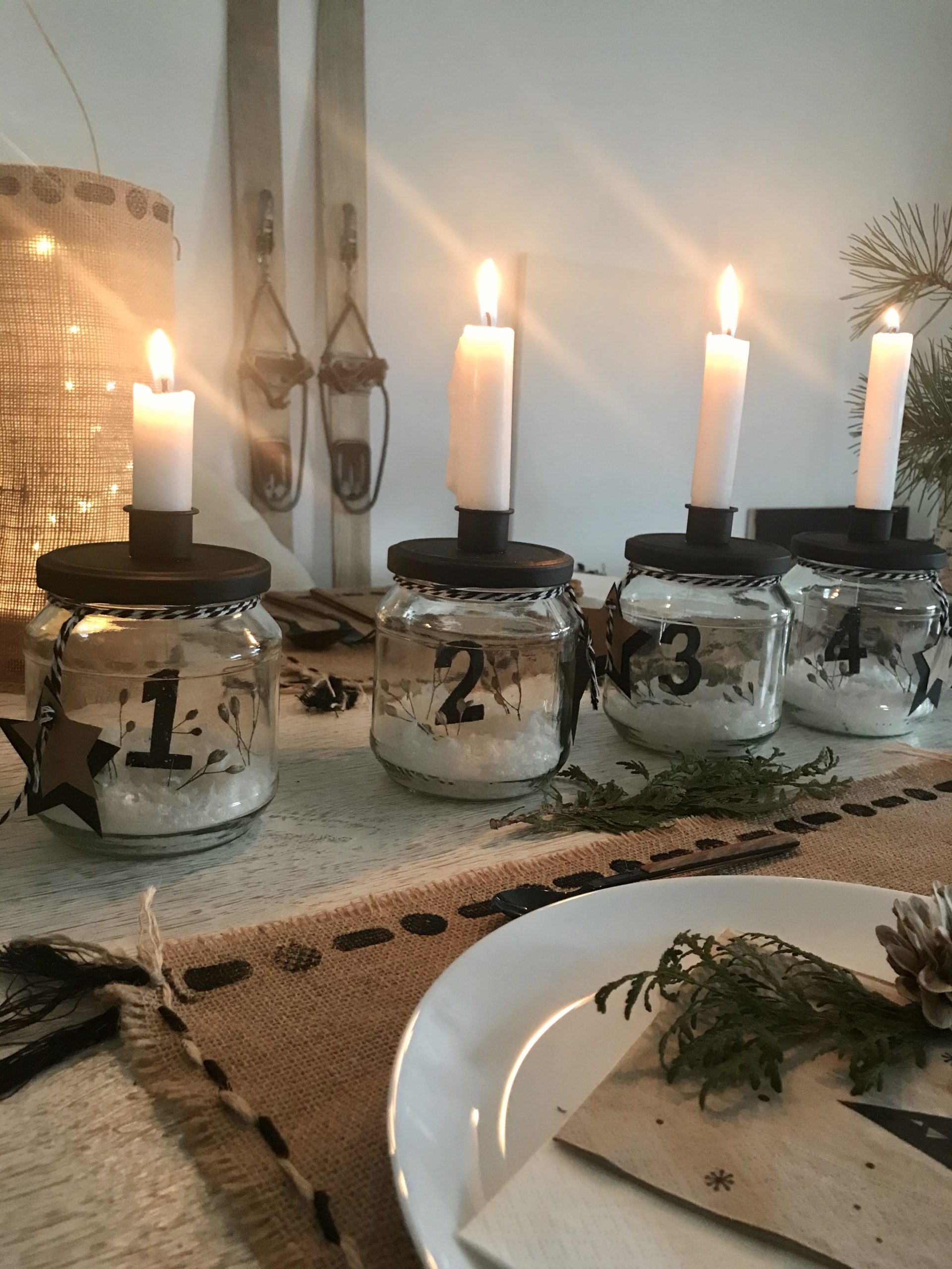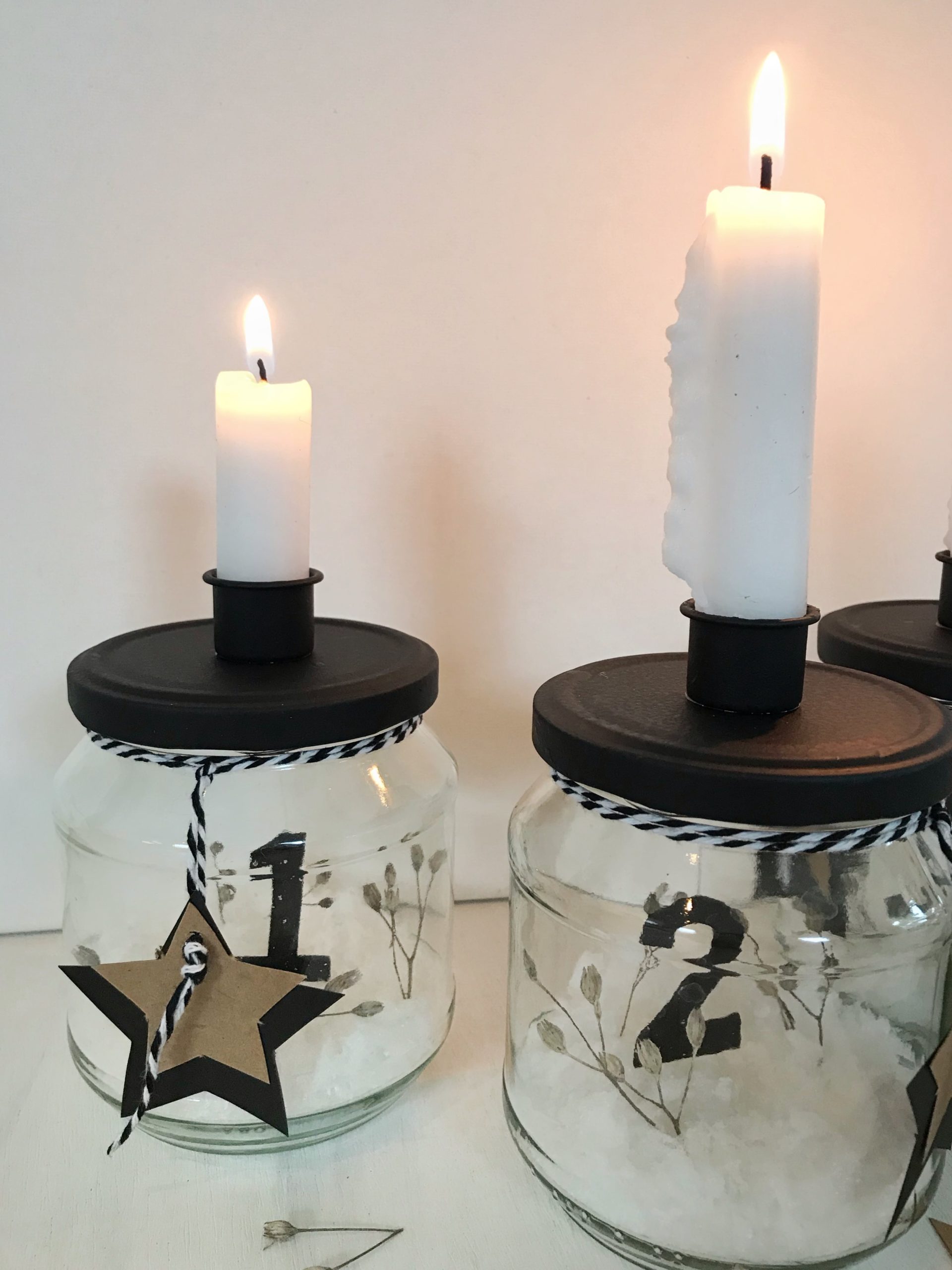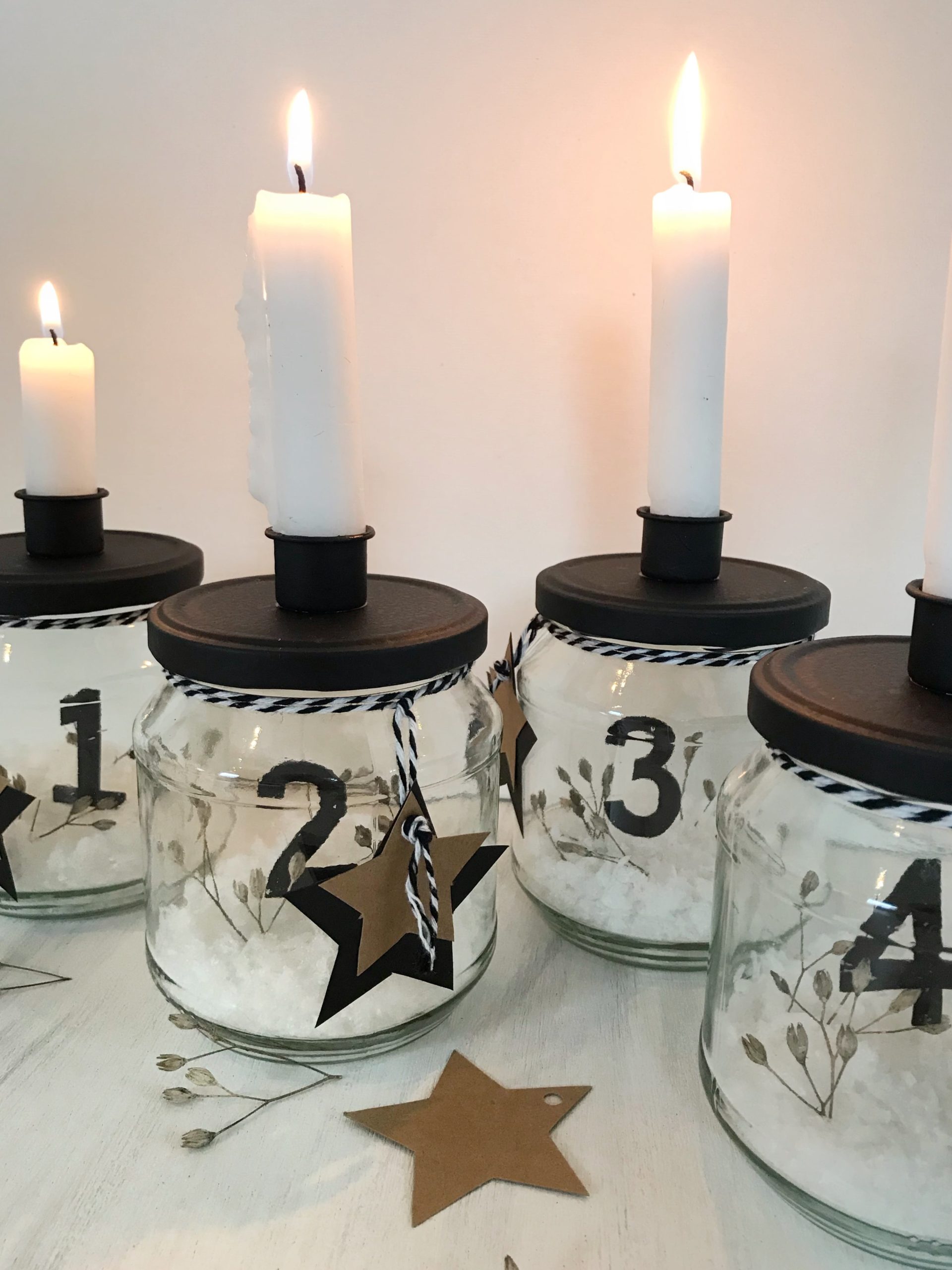 - Nun könnt ihr eure Gläser noch schön dekorieren. Ich habe dafür in etwas Kunstschnee ein paar Trockenblumen gesteckt und am Hals der Einmachgläser eine Sternanhänger gebunden. Weniger ist bei dem skandinavischen Adventskranz mehr. Die Skandinavier lieben es ja eher schlicht, reduziert und natürlich.