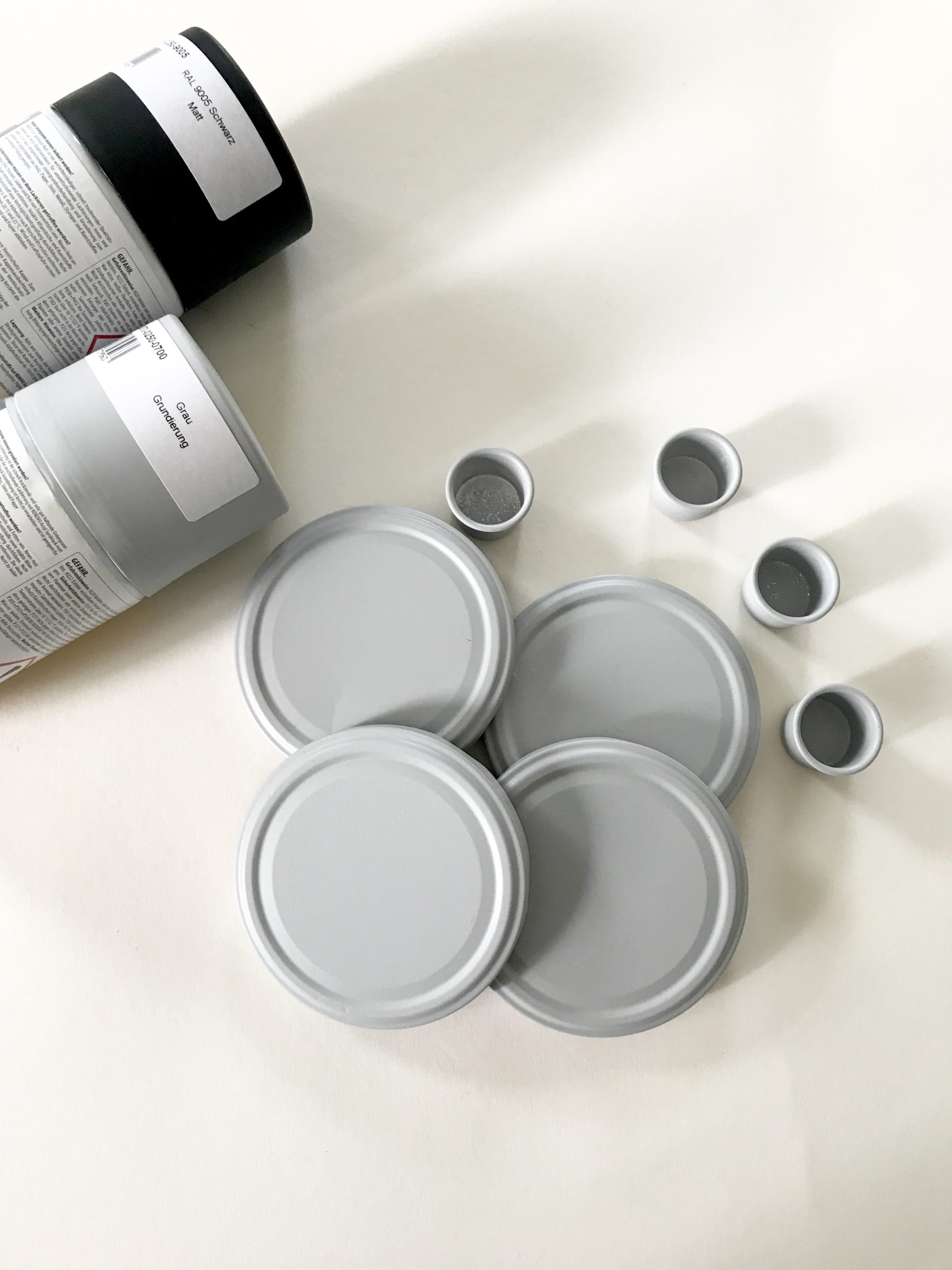 - Die getrockneten Deckel, die Holzzahlen und die Kerzentüllen lackiert ihr nun in der Farbe eurer Wahl. Meine Empfehlung ist eine Universal Grundierung zum Sprühen und dann ein Sprühlack in mattem Schwarz. Das Lackieren dauert ein paar Tage, weil ihr immer wieder Trocknungszeiten einplanen müsst und bis ihr jeden Winkel erwischt habt, dauert es eben etwas.